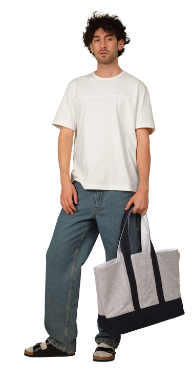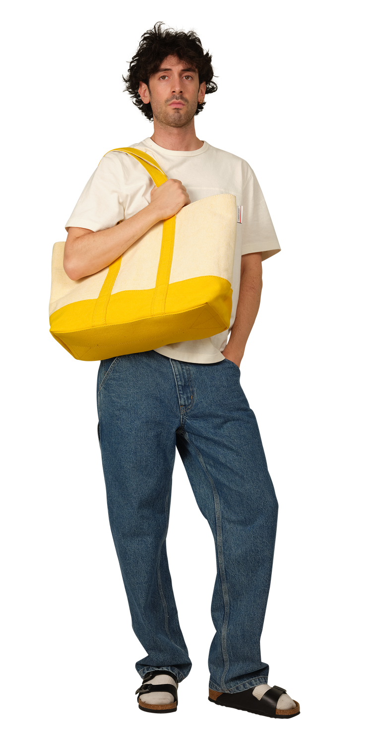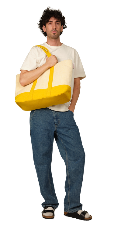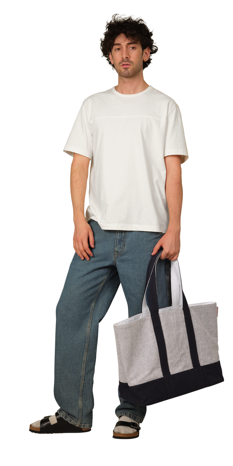 The Tote is made of heavy cotton canvas with color combo of white and vibrant primary colors. An interior gusset in contrast white canvas expands vertically to give you extra space when zipping.