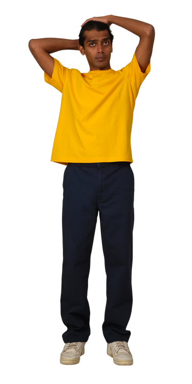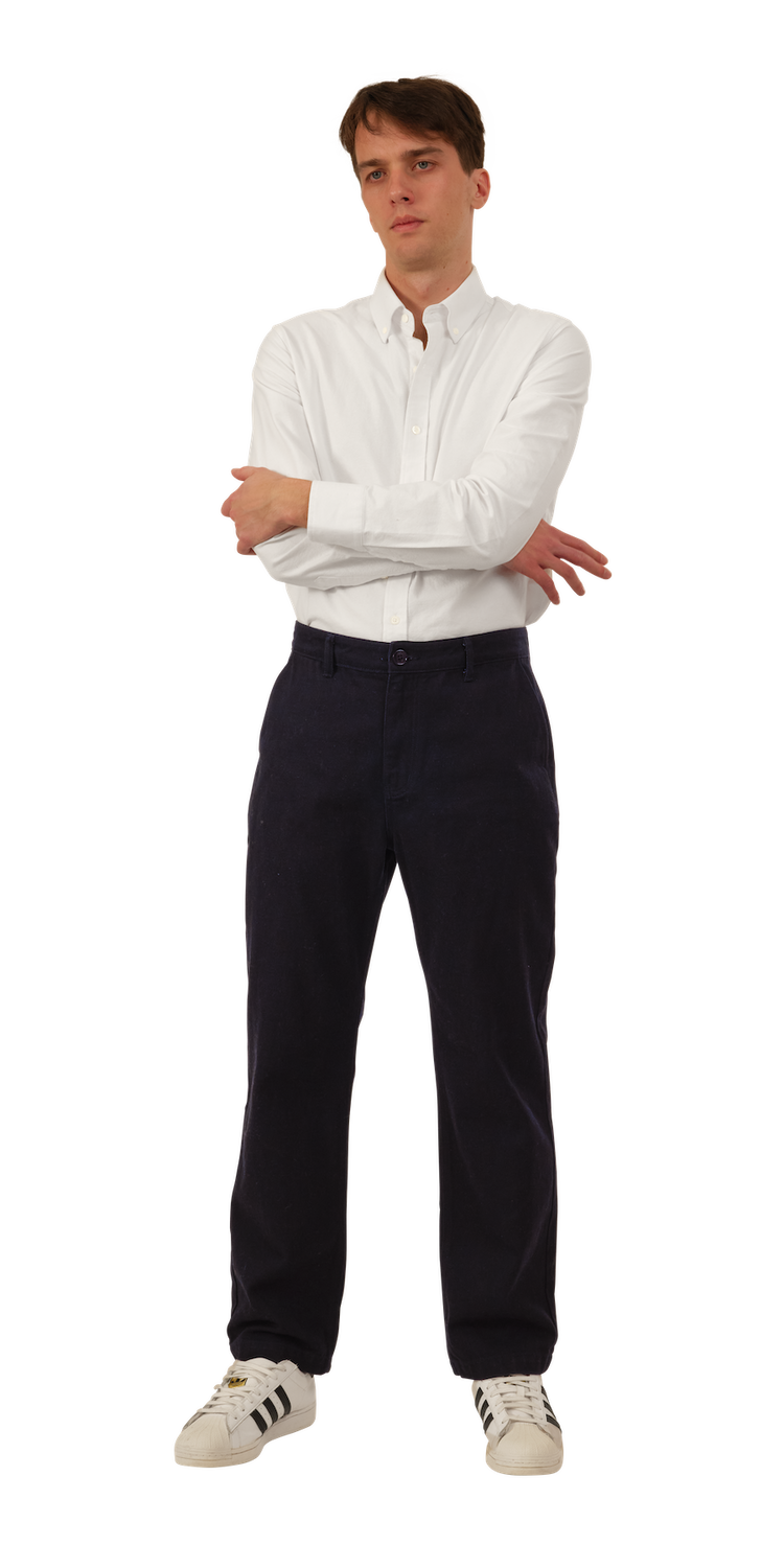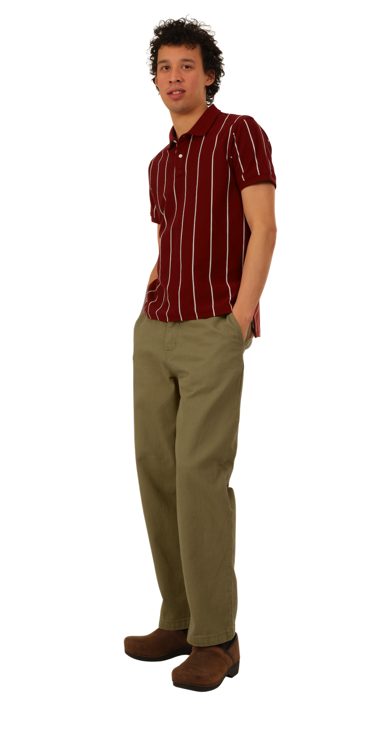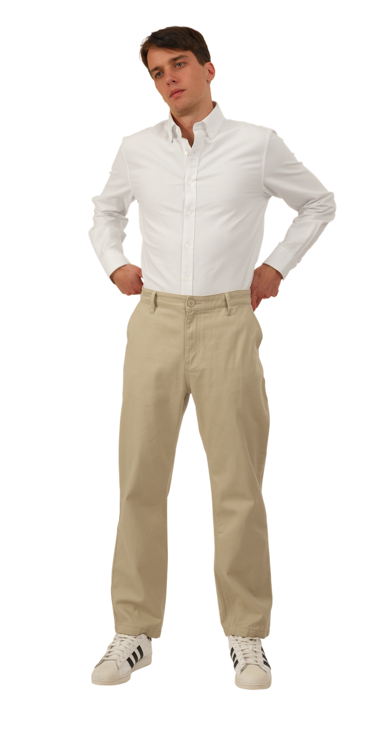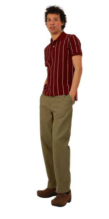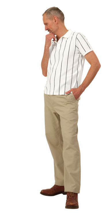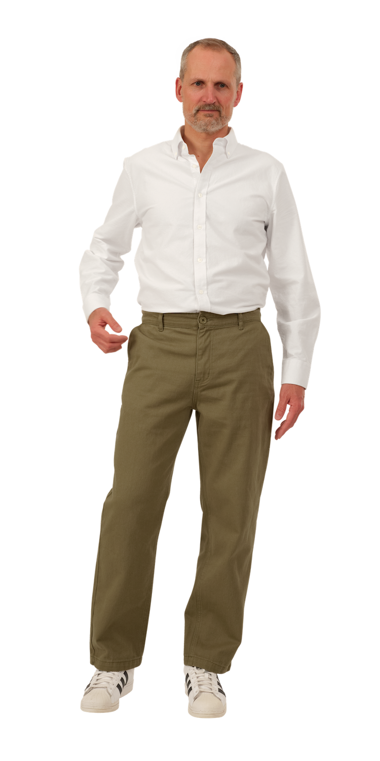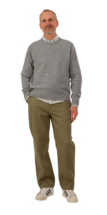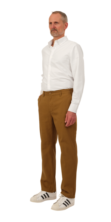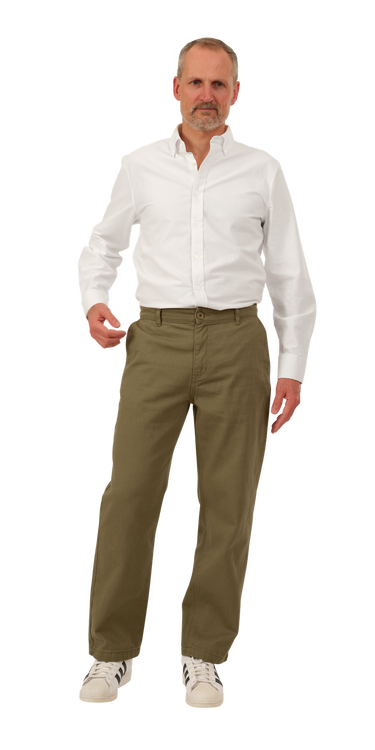 Chinos are made in a thick, washed twill. They have 4 pockets and a relaxed fit.
