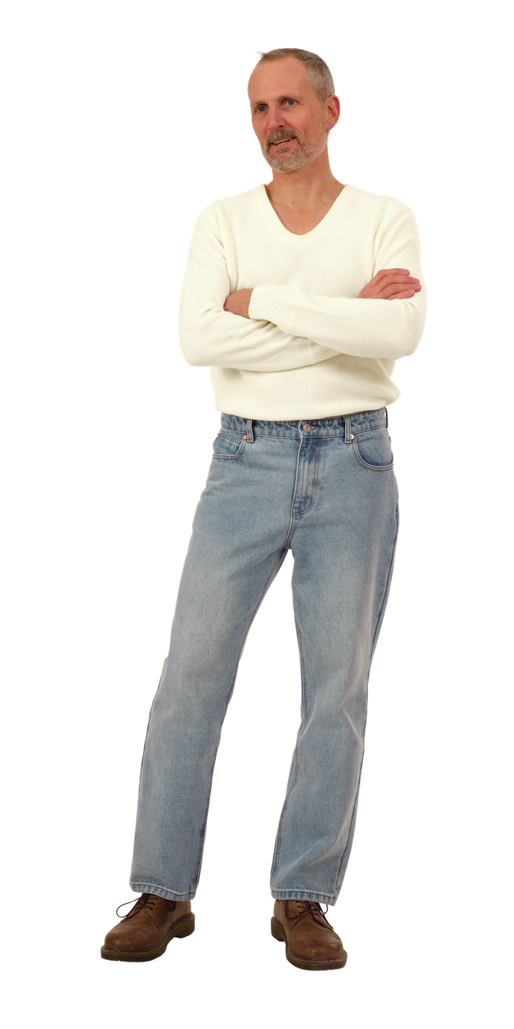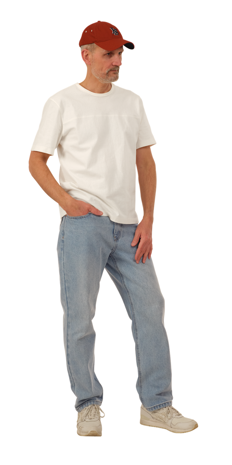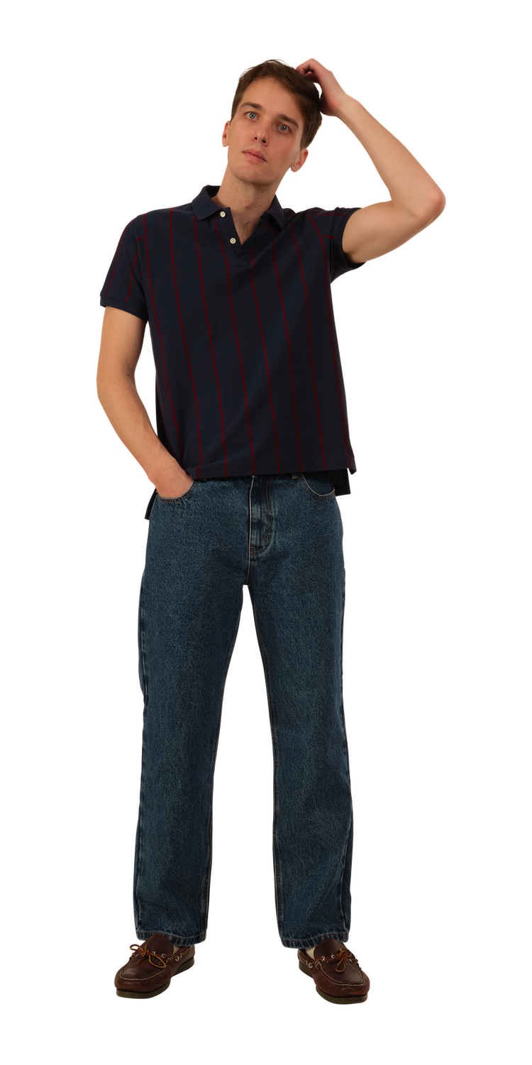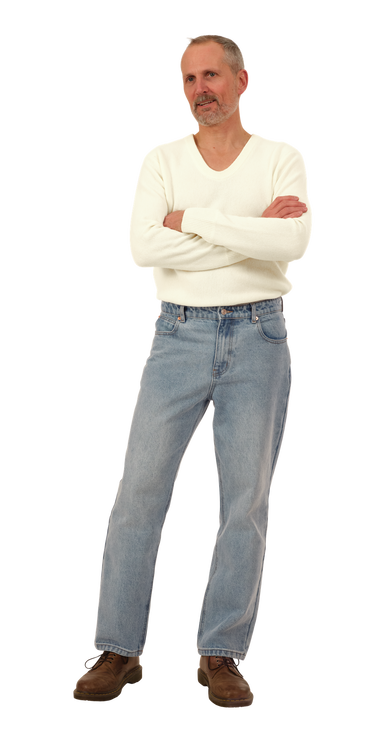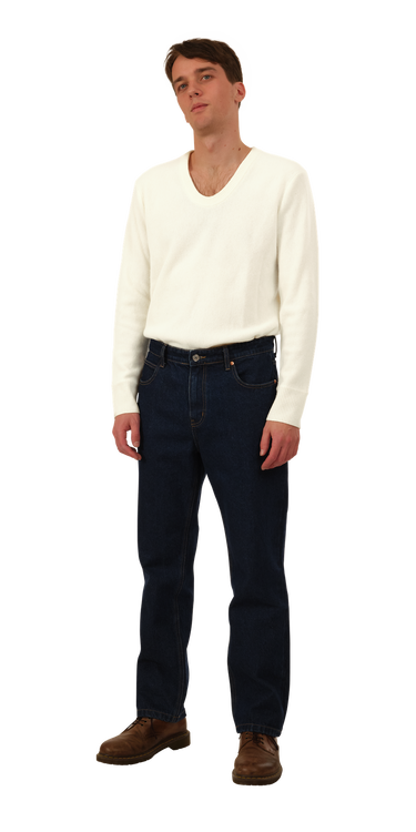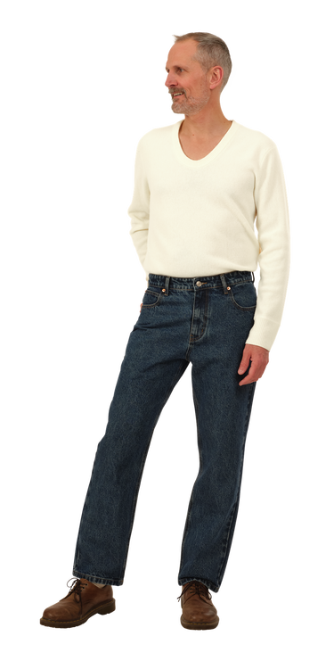 5 Pocket Blue Jeans are made of heavy, 13.5 oz cotton denim. They have a classic jean shank, zip fly, and a relaxed fit.