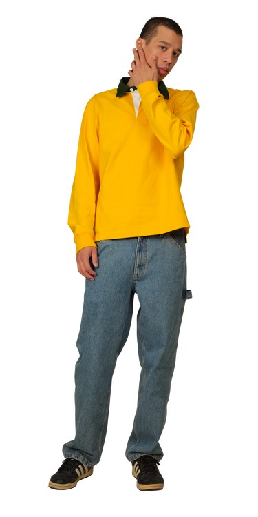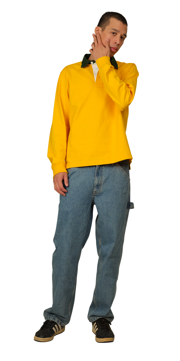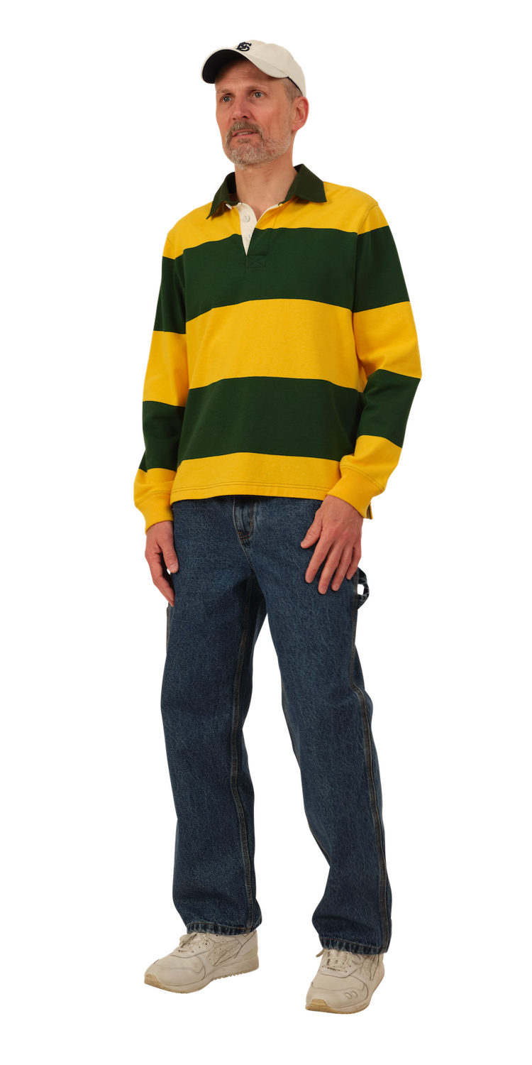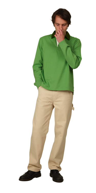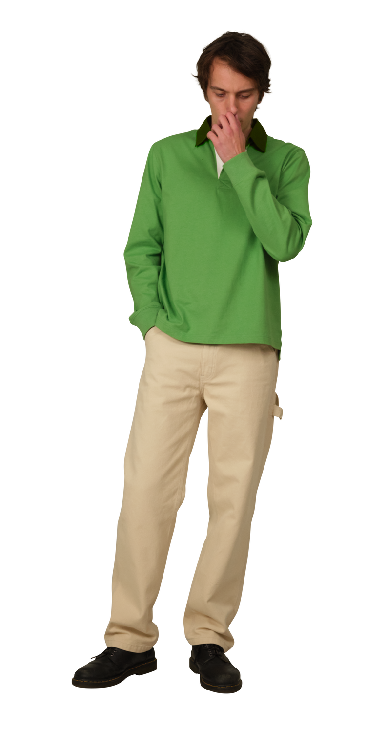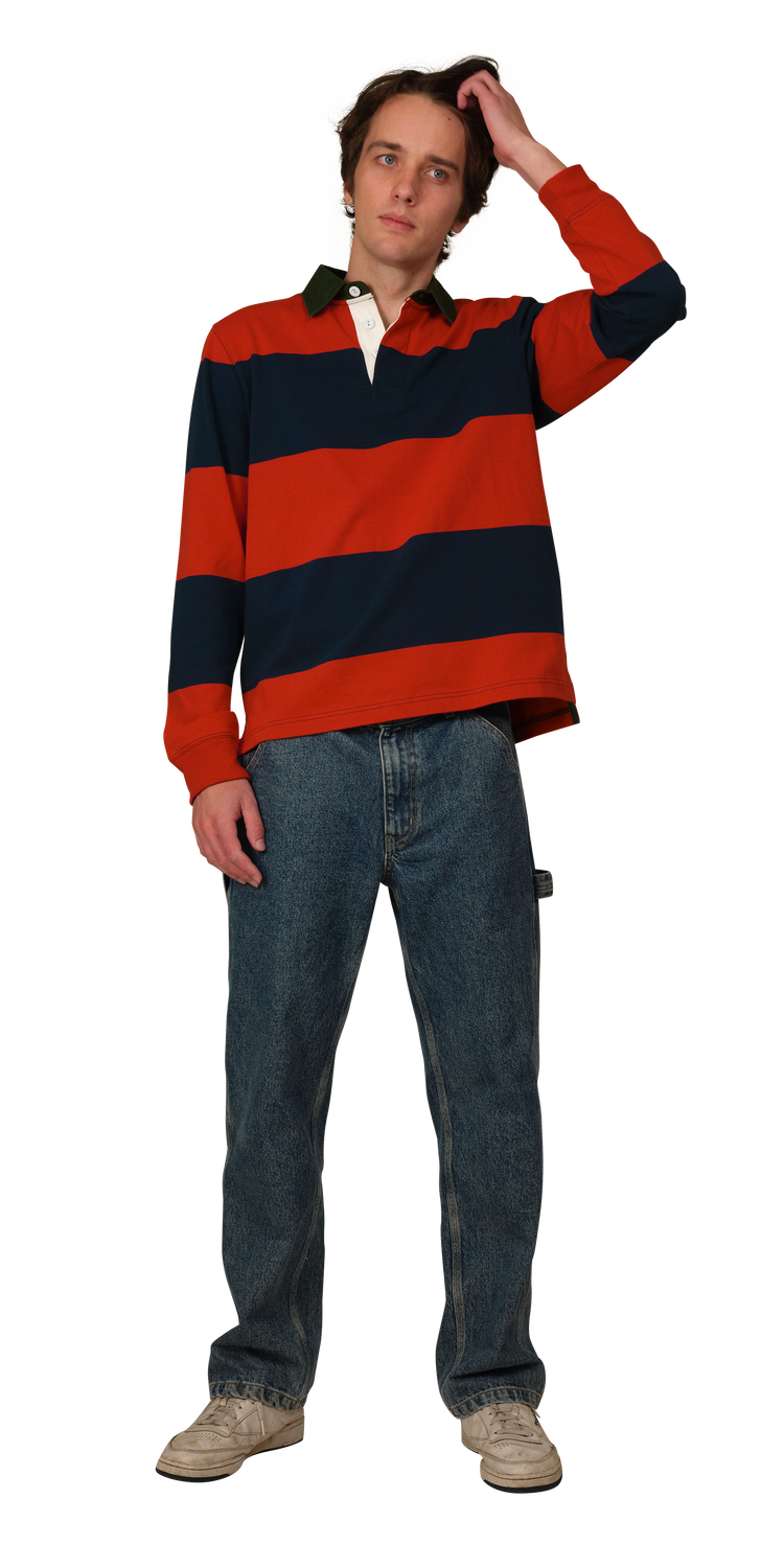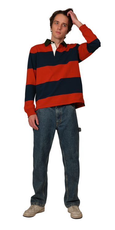 The Rugby Shirt is made of heavy dry jersey. It has traditional rubber buttons, a cotton twill collar, and grosgrain trim.