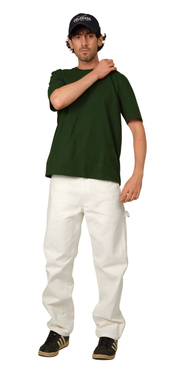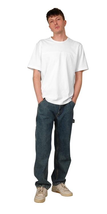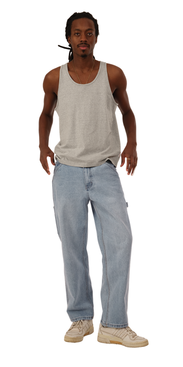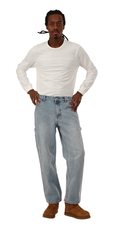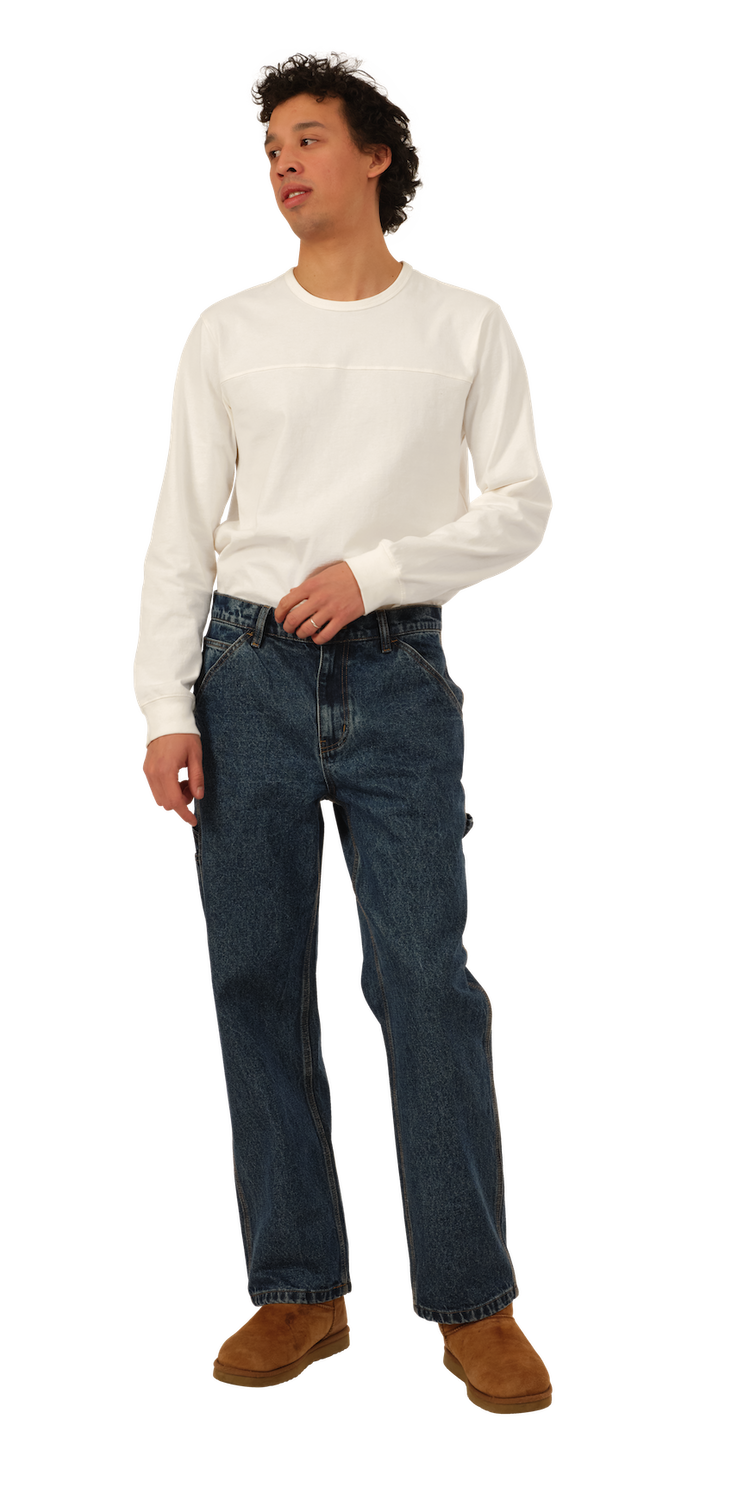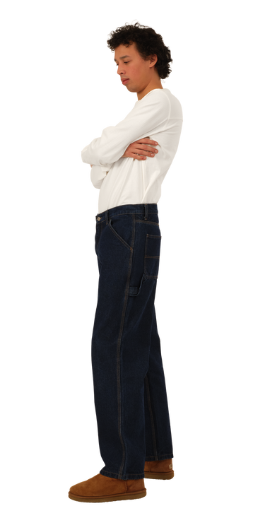 Denim Carpenter Jeans are made of a thick 13.5 oz cotton denim. They have a hammer loop, 4 pockets, and a relaxed fit.