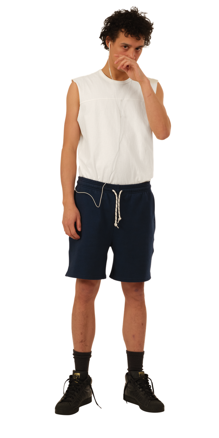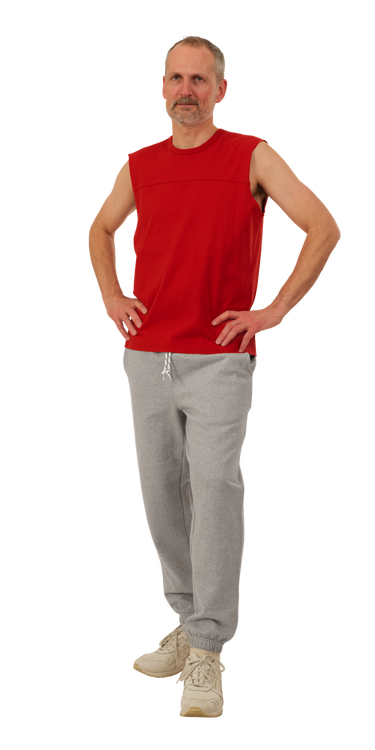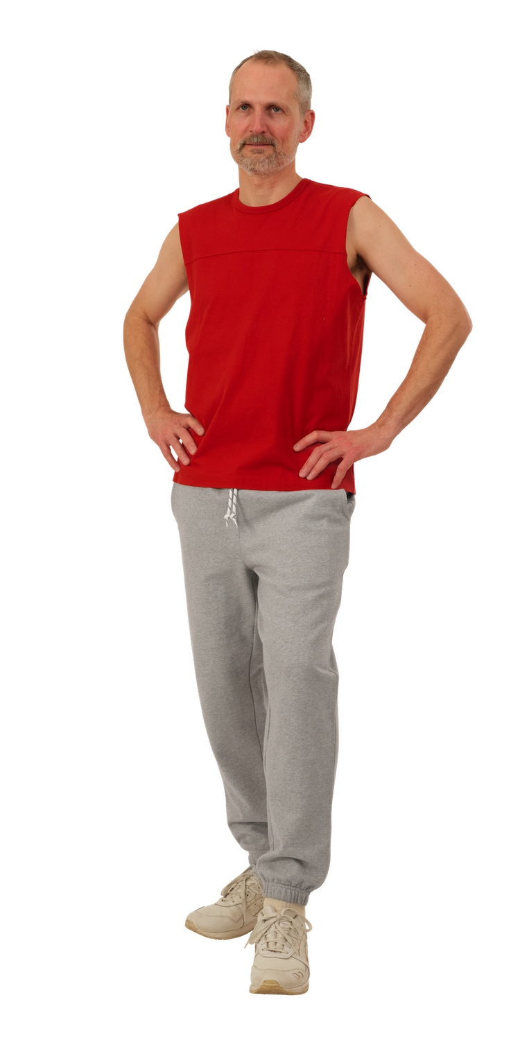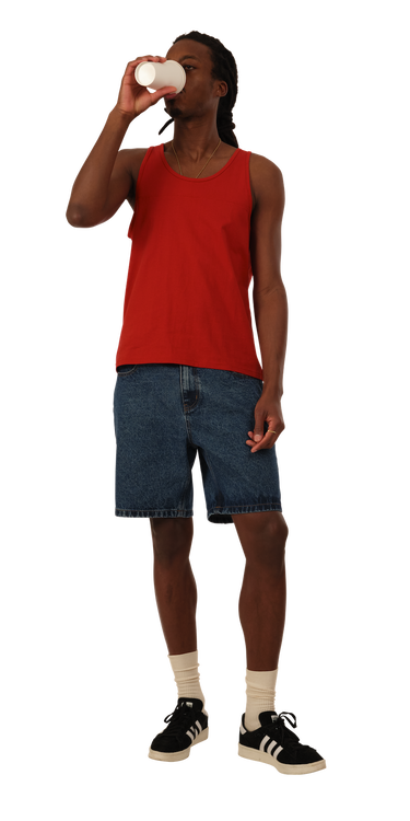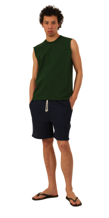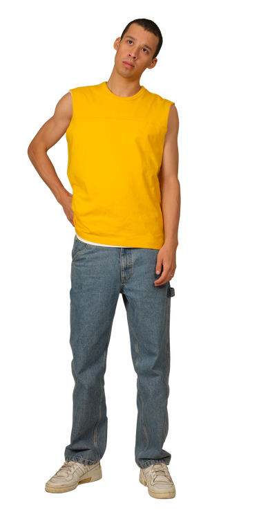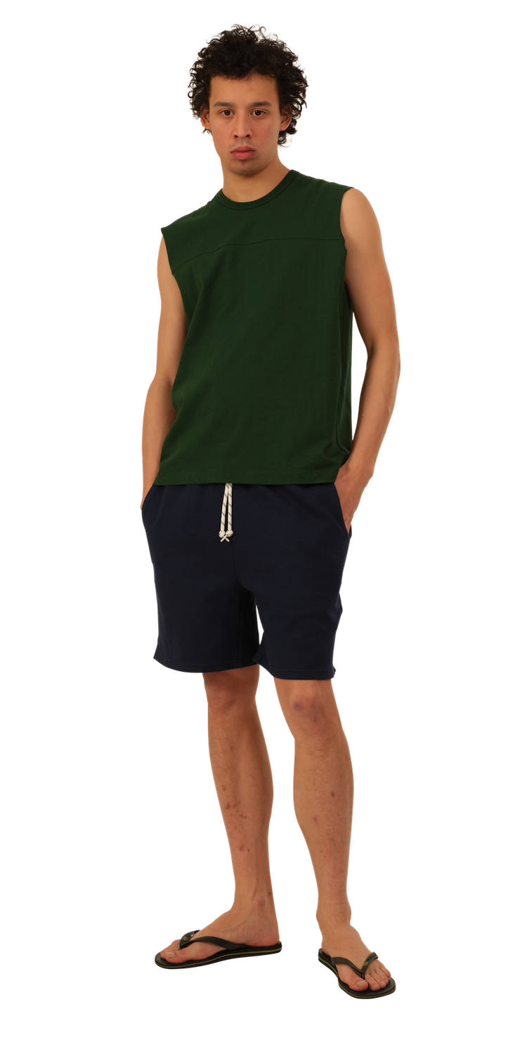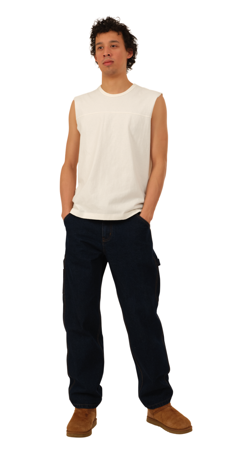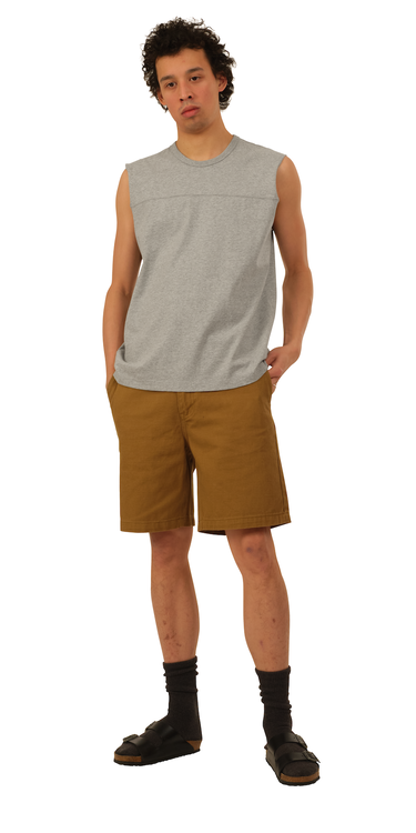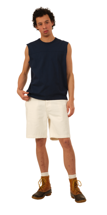 The Sleeveless Tee is made of mid-weight cotton jersey. It has a signature yoke, casual fit, and an overlocked armhole.