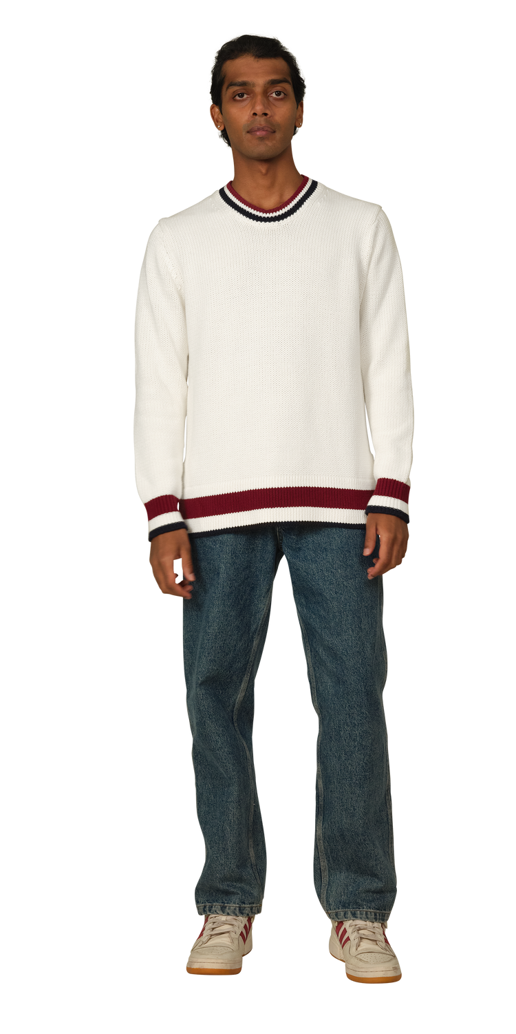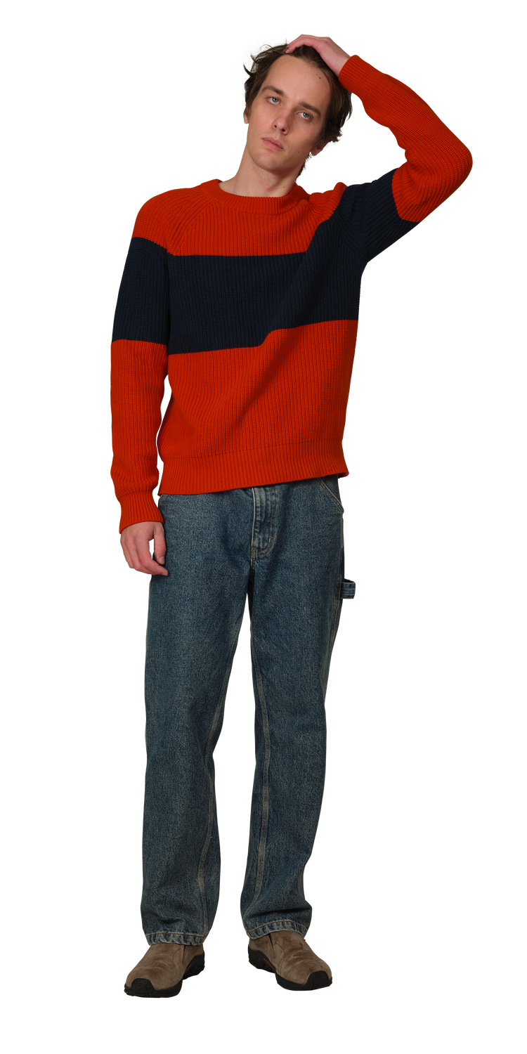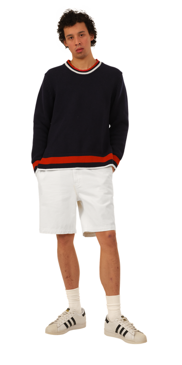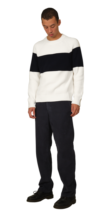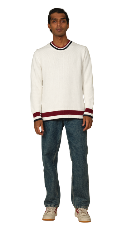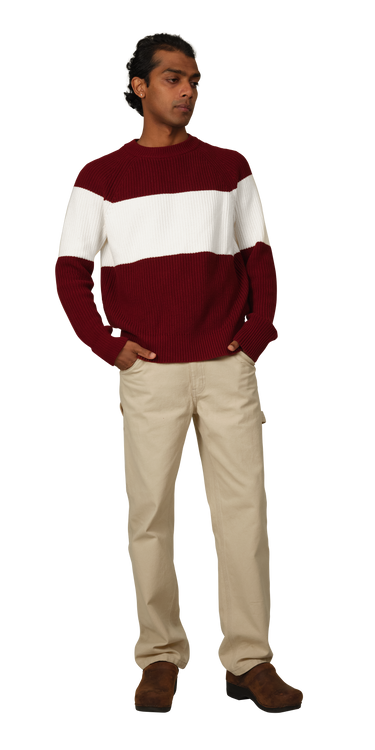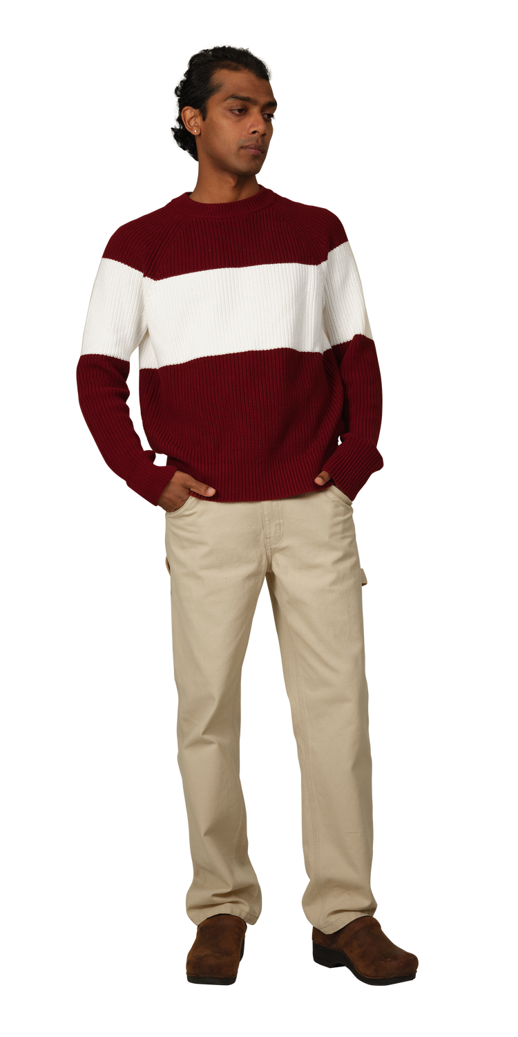 The Crewneck Sweater is a ribbed, raglan sleeve knit in mid-weight cotton with a wide collegiate stripe.