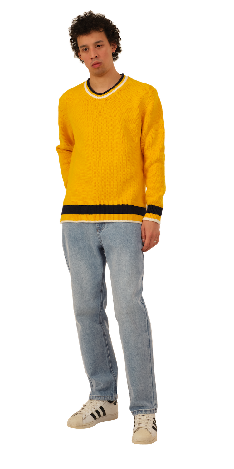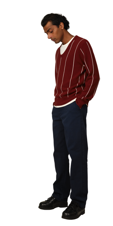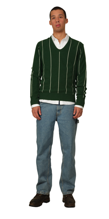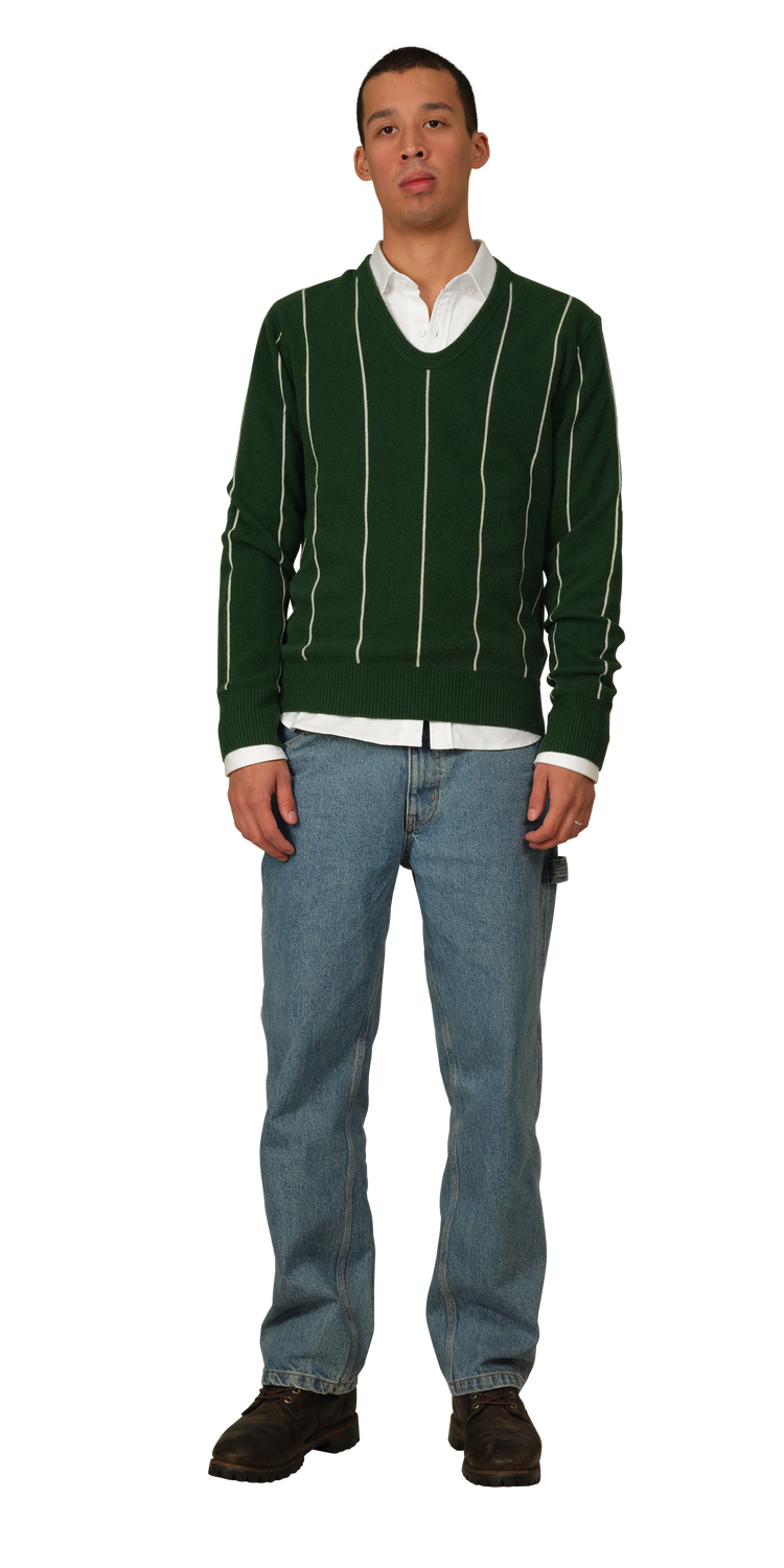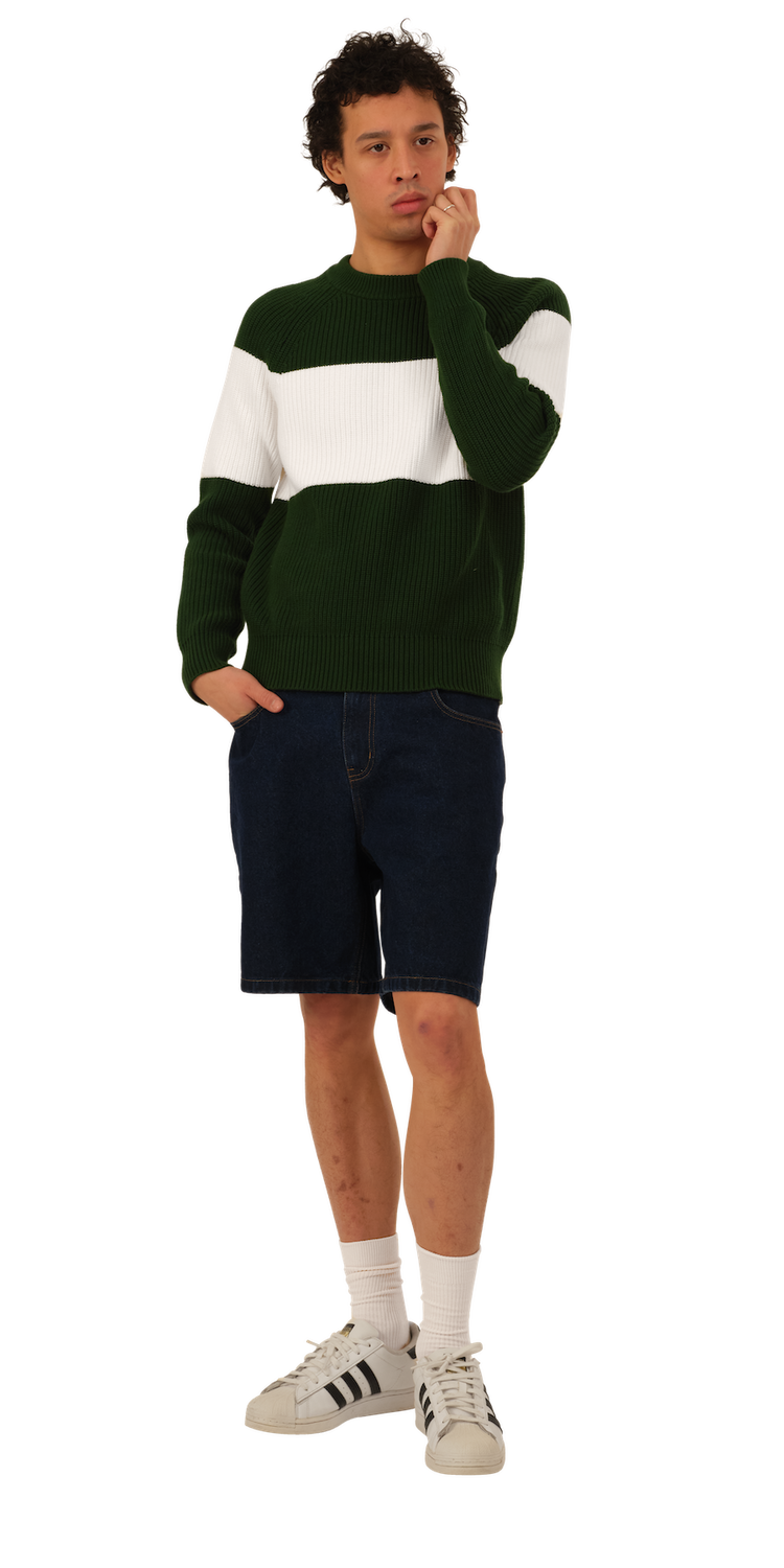 The Crewneck Sweater is a ribbed, raglan sleeve knit in mid-weight cotton with a wide collegiate stripe.