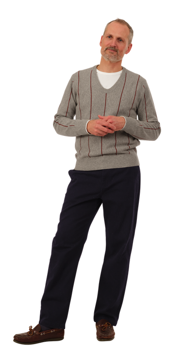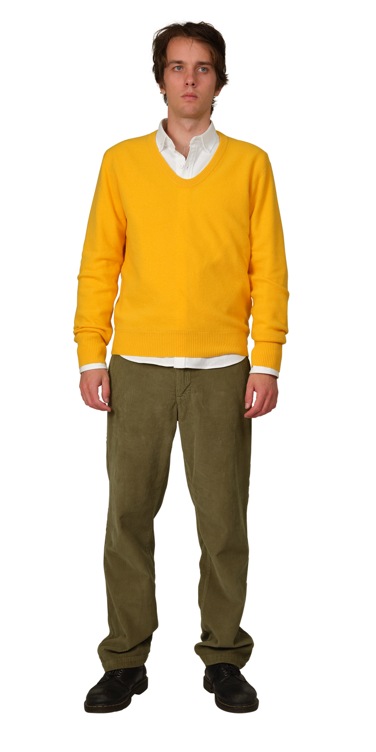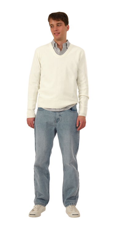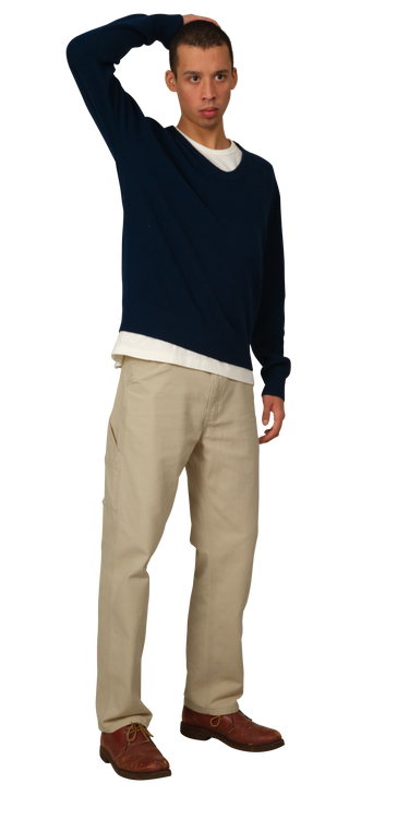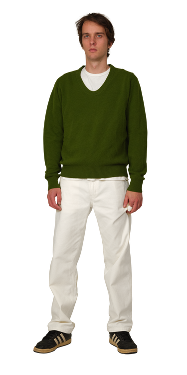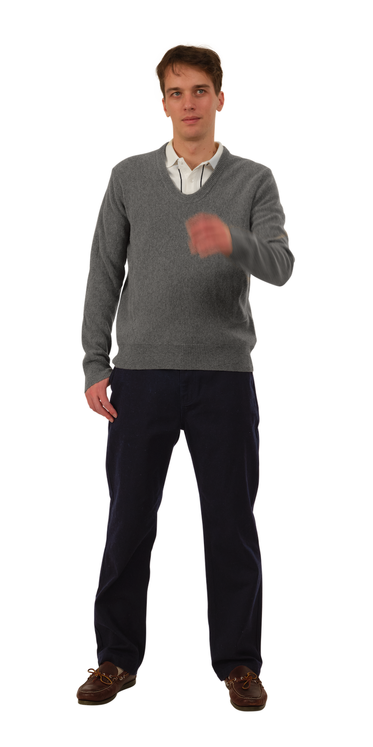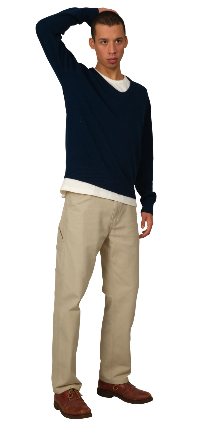 The U-Neck Sweater is made of cotton. It has a dropped neckline, a side vent, and is drapey. Our signature neck shape.