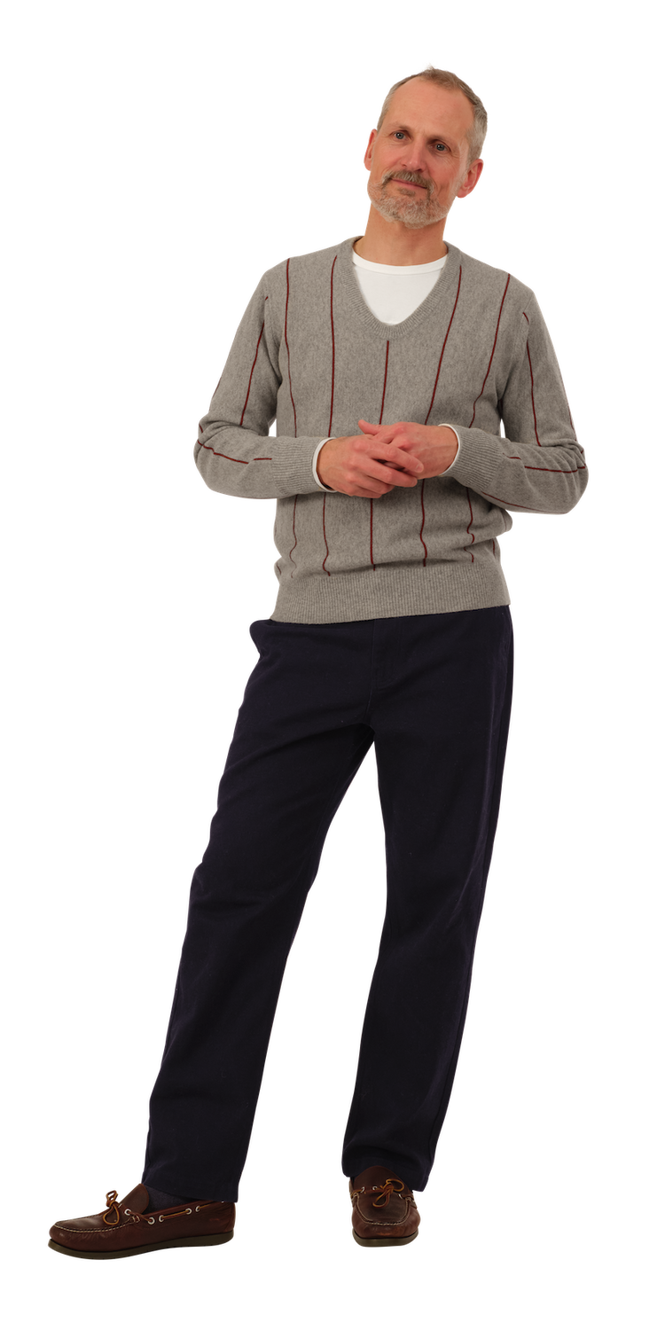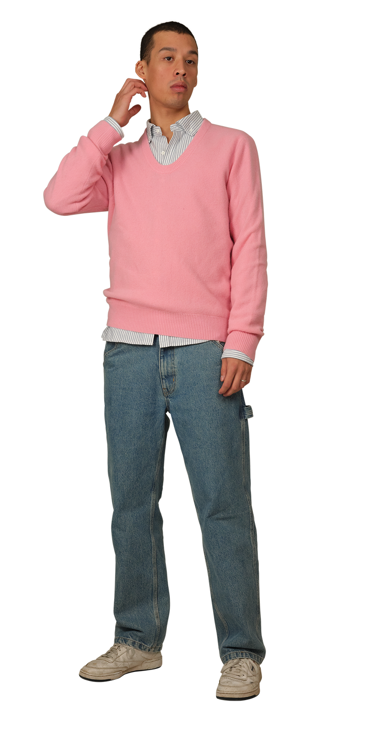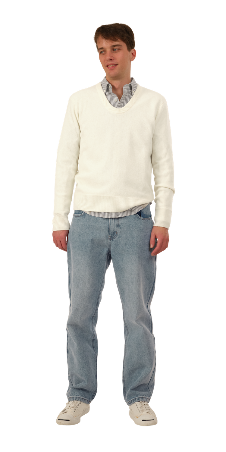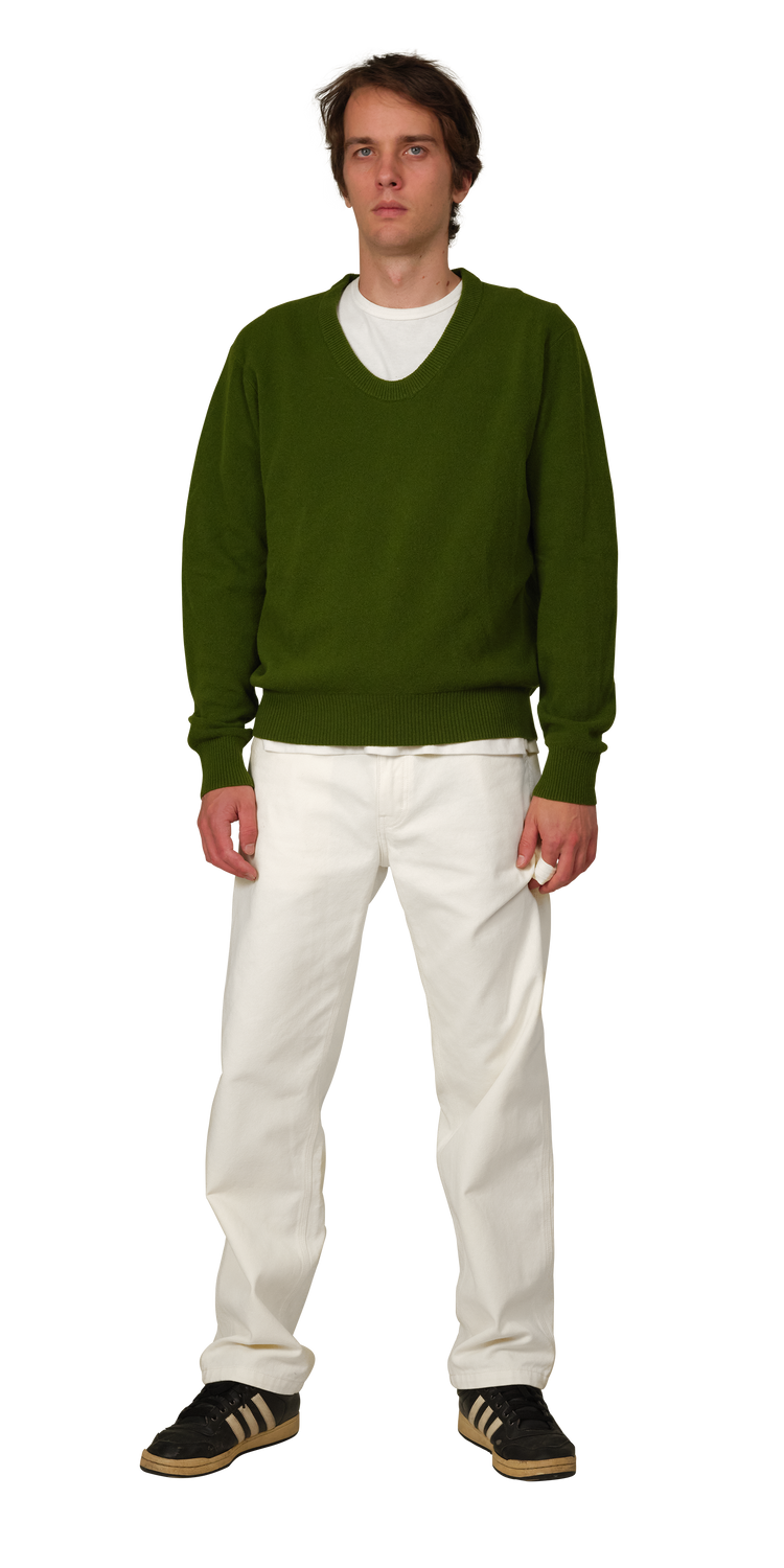 The Thin U-Neck Sweater is made of a wool recycled nylon blend. It has a dropped neckline, long cuffs, and is breathable. An all-seasons sweater.