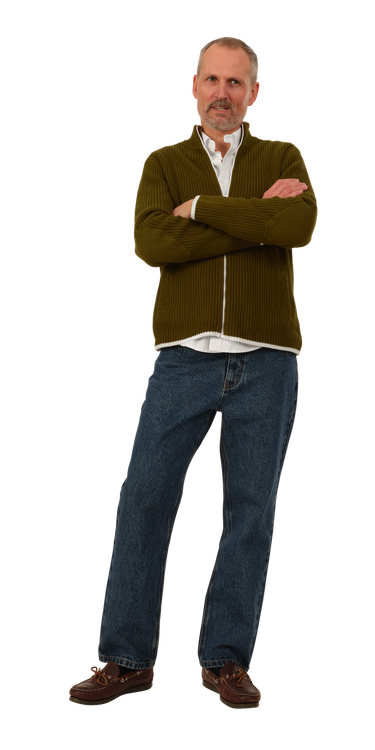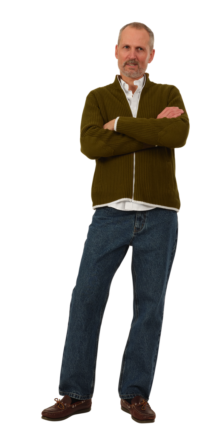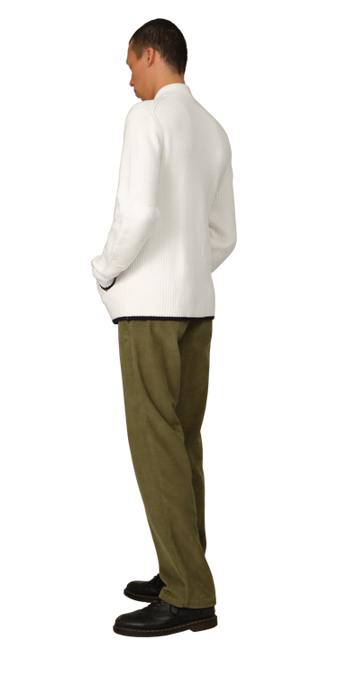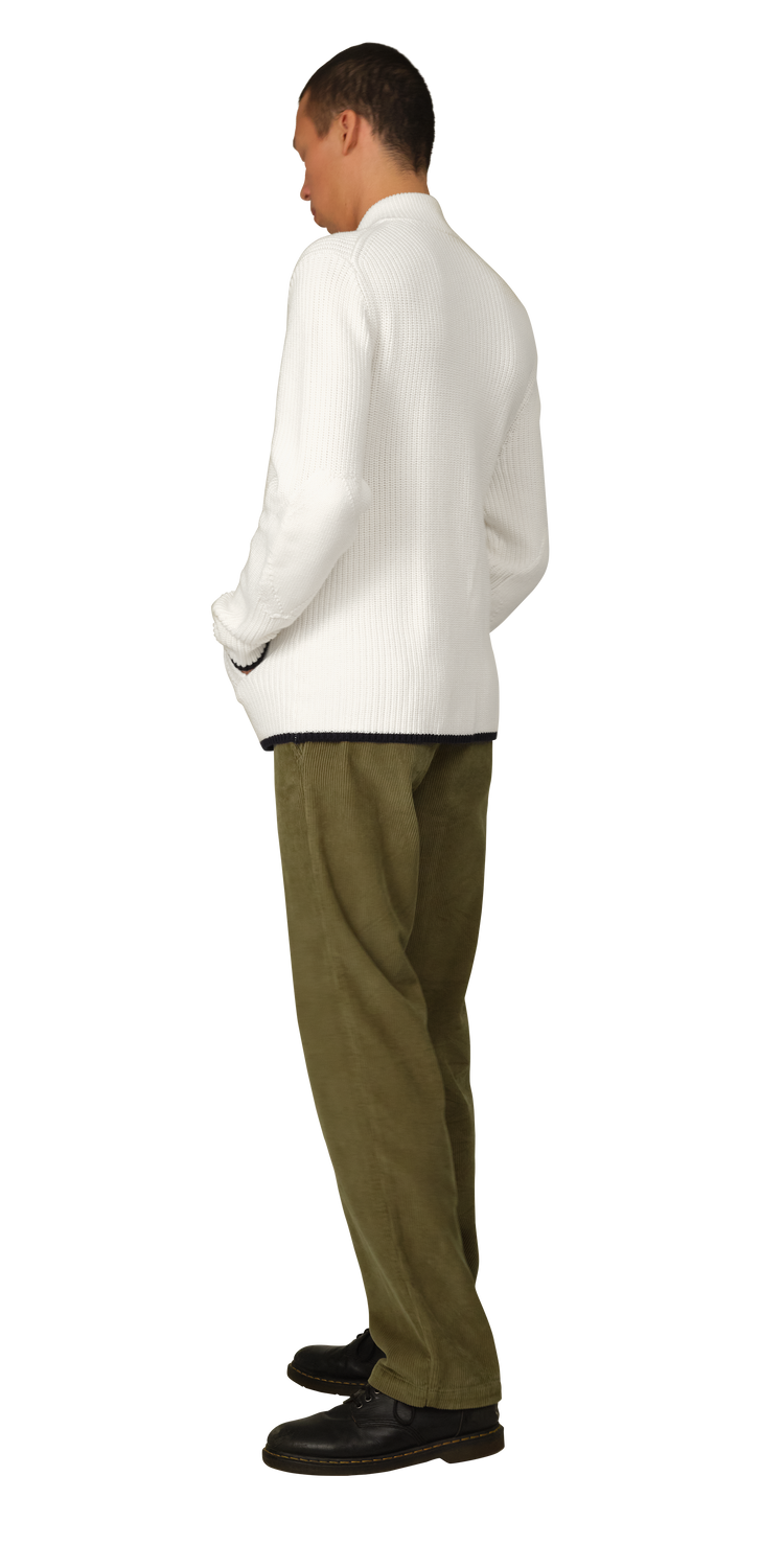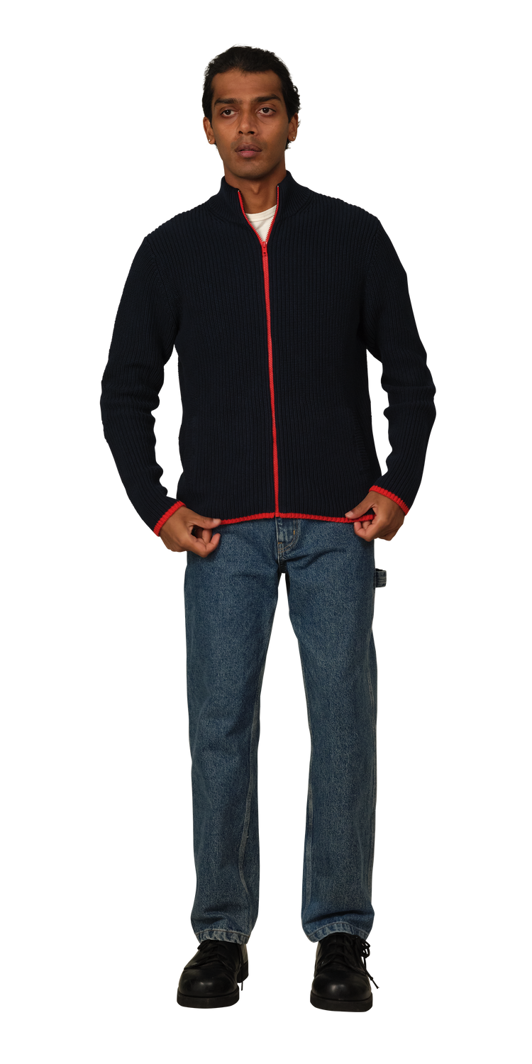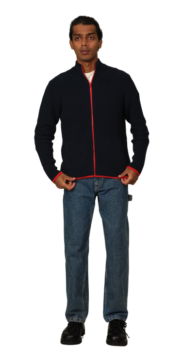 The Zip Cardigan is made of a mid-weight cotton rib. It has a contrast nylon zipper, two pockets, a mock-neck collar, and contrast hem and wrist trim. Sharp and clean.