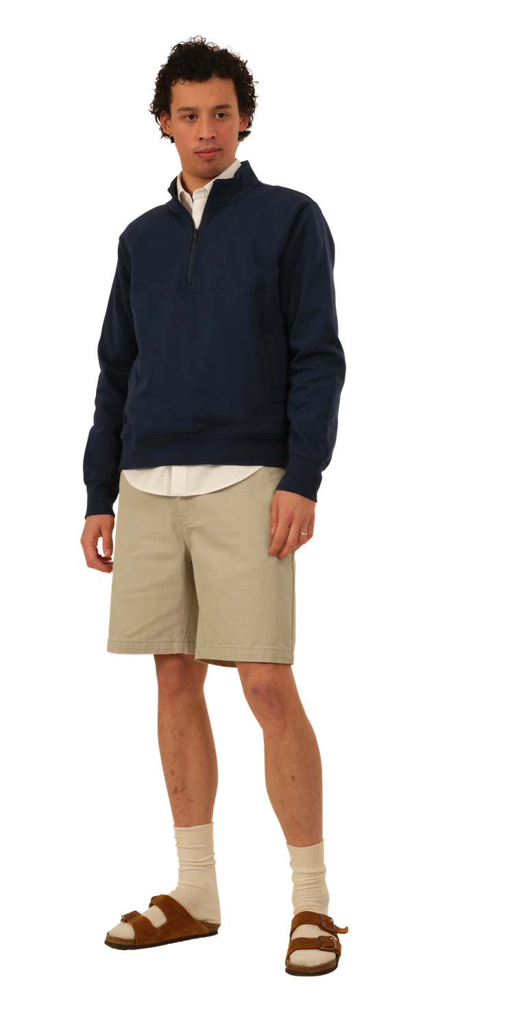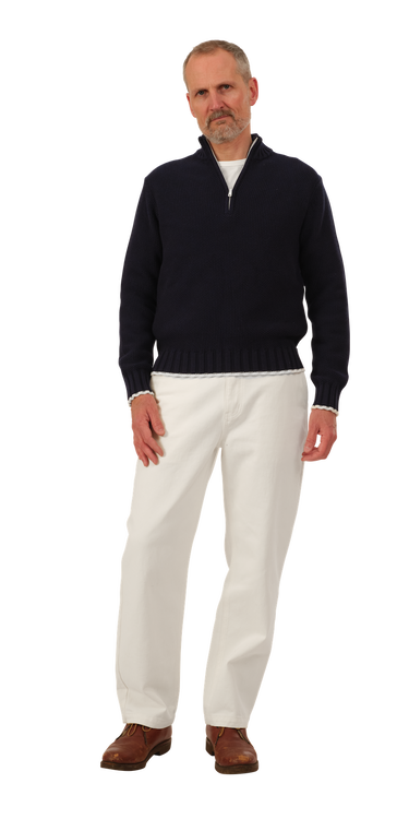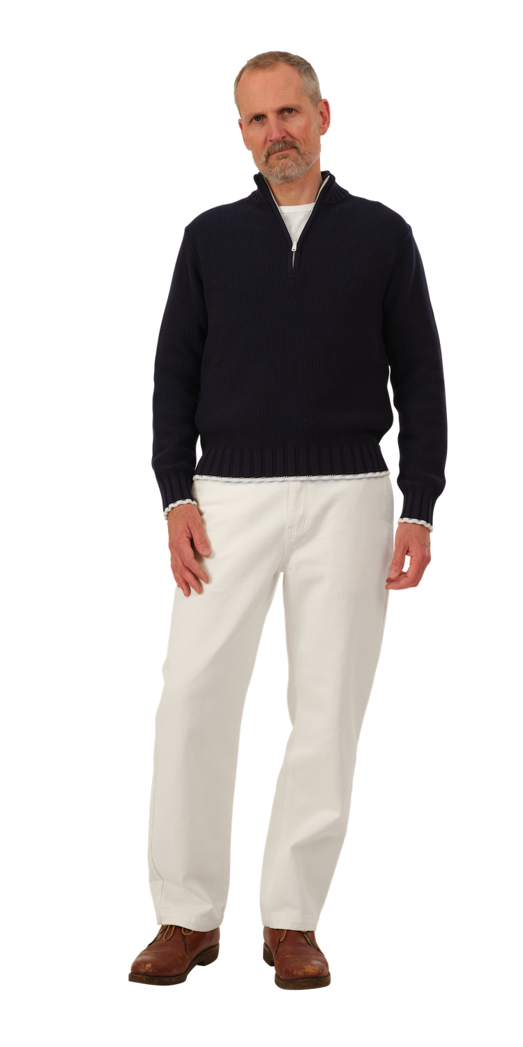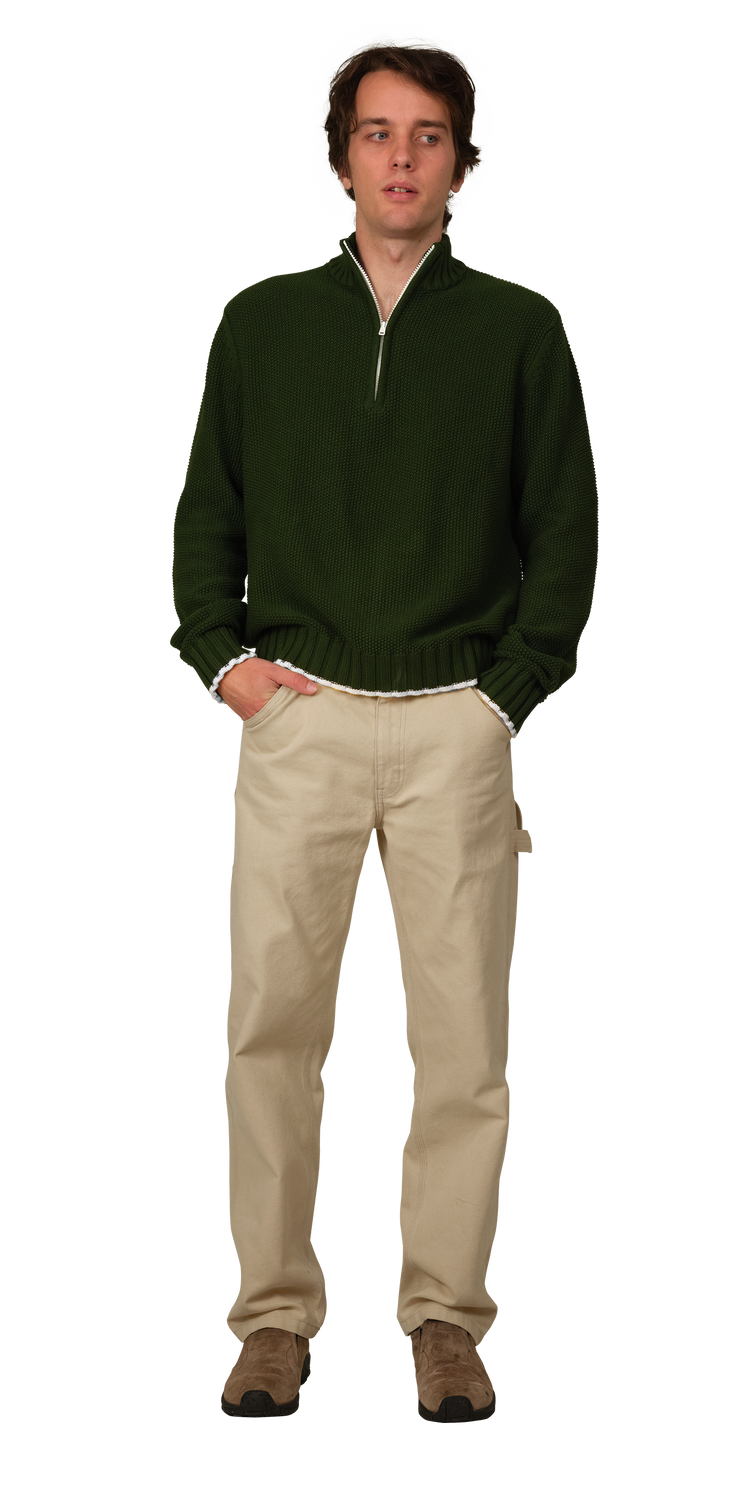 The Quarter Zip is made of a mid-weight cotton seed stitch. It has a nylon zipper, a mock-neck collar, and contrast trim on the sleeves.