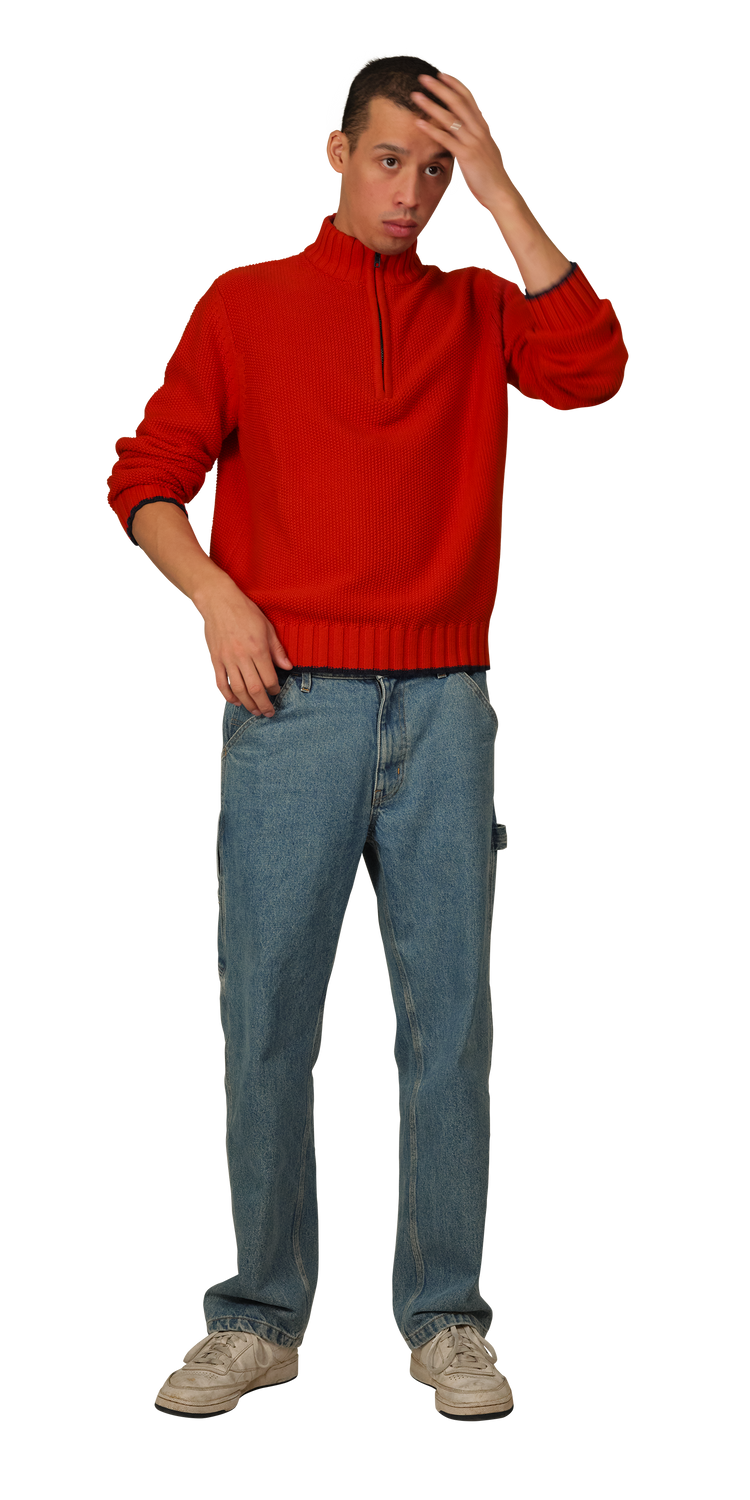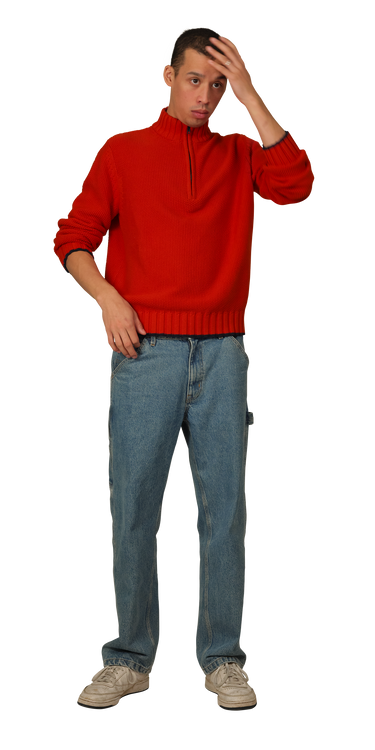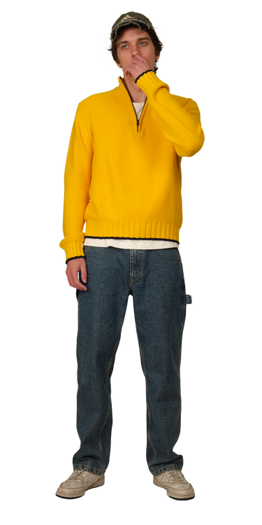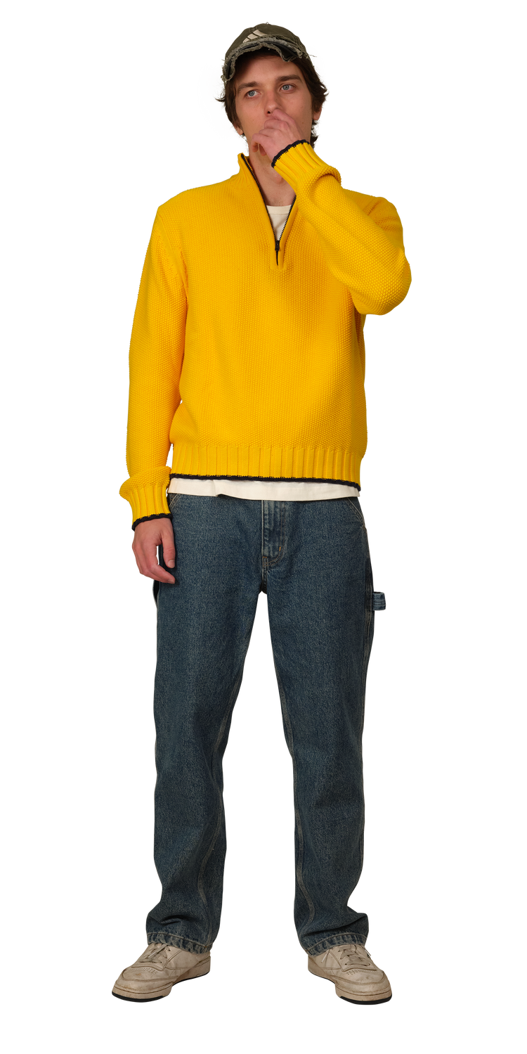 The Quarter Zip is made of a mid-weight cotton seed stitch. It has a nylon zipper, a mock-neck collar, and contrast trim on the sleeves.