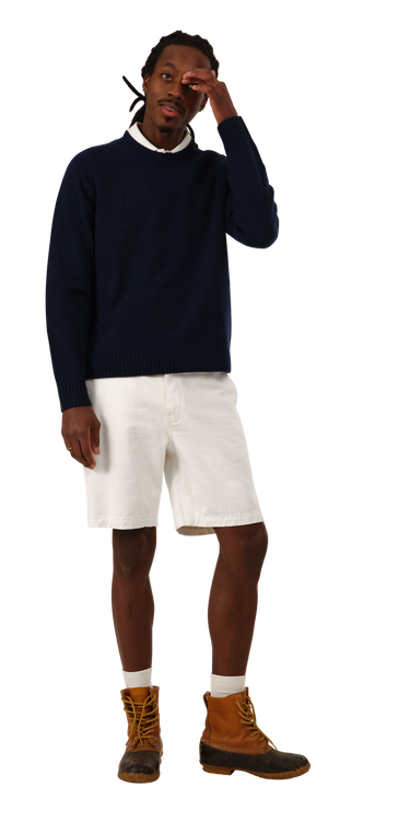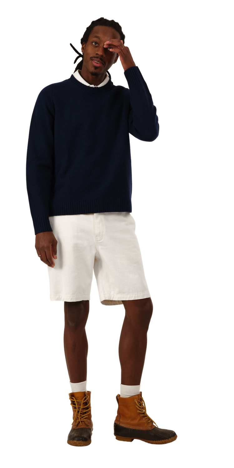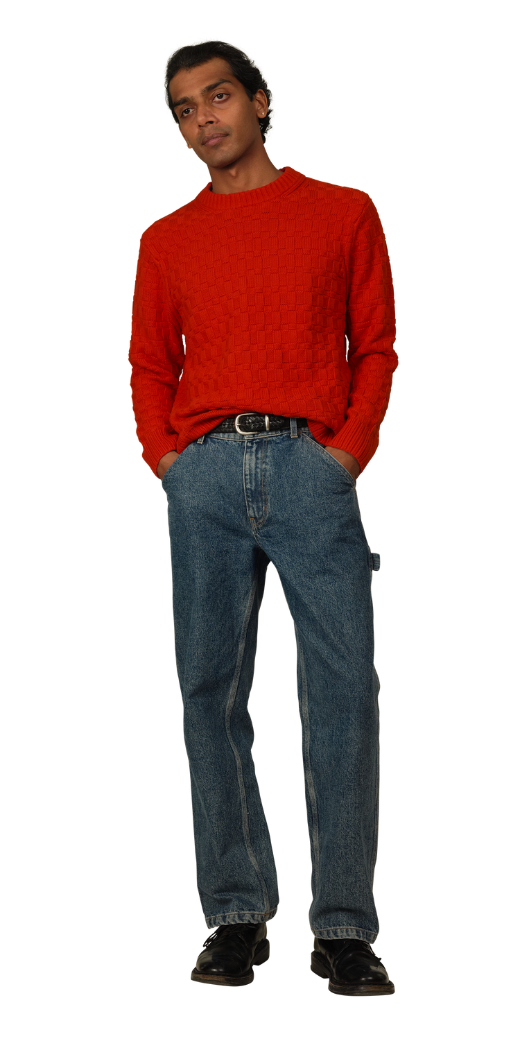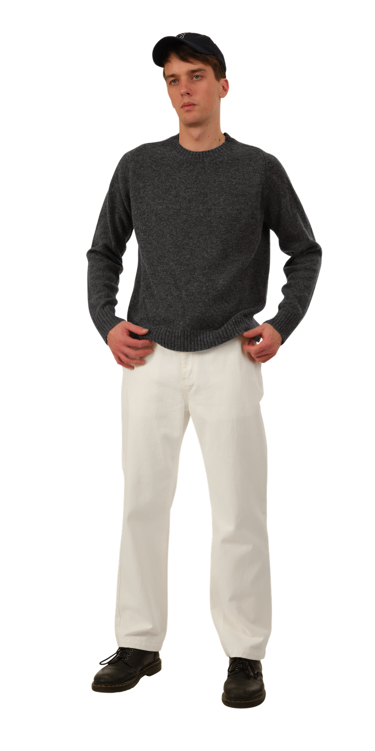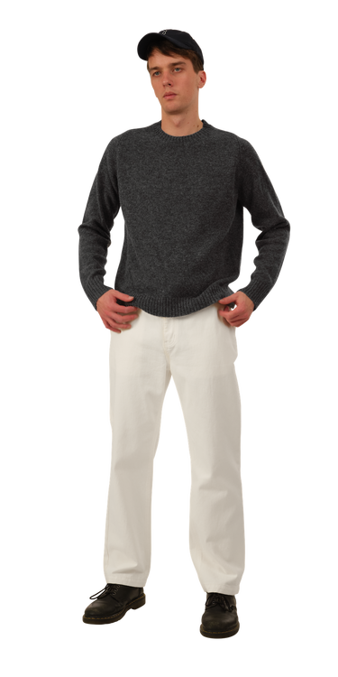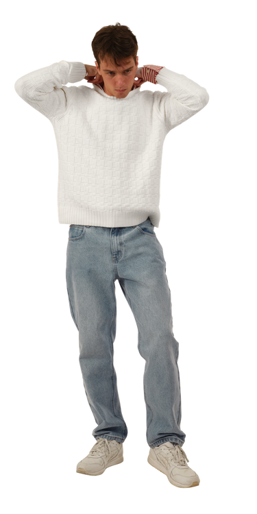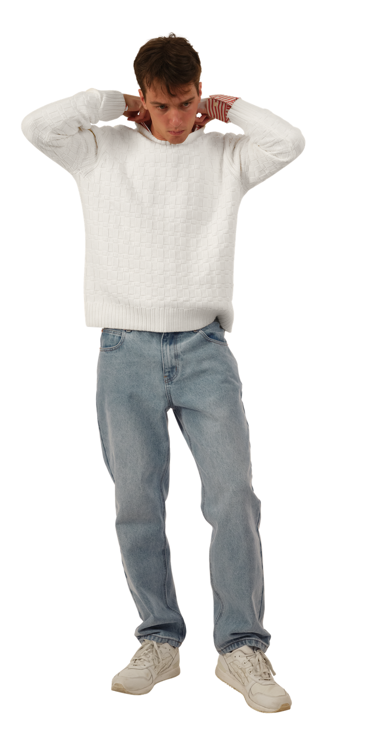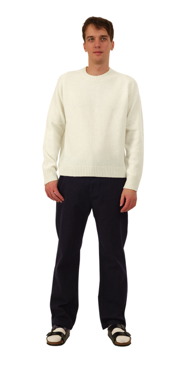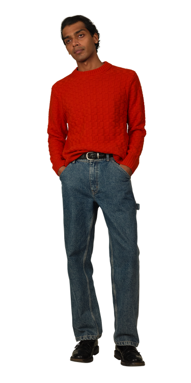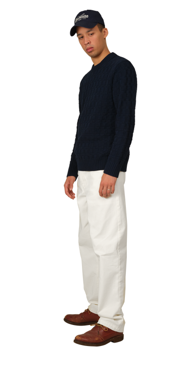 The Basketweave Sweater is a mid-weight cotton knit with a 'woven' texture. It has a crew neck and a chunky rib at the wrist and hem.
