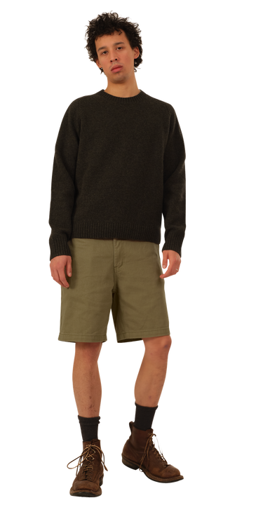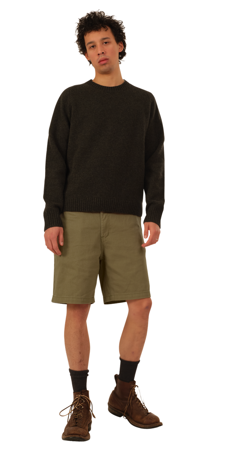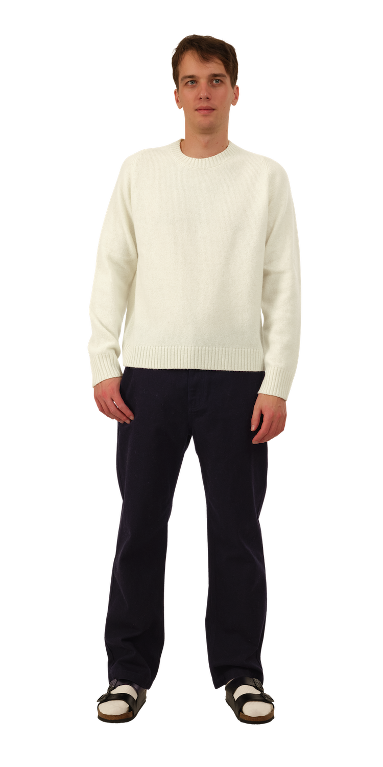 The Raglan Crew is a 100% Wool Sweater, with a 3x3 ribbing cuff and hem, and a classic horizontal raglan evocative of the mid century.