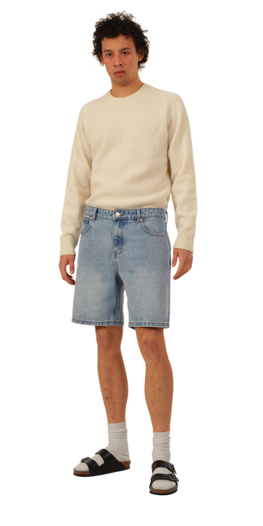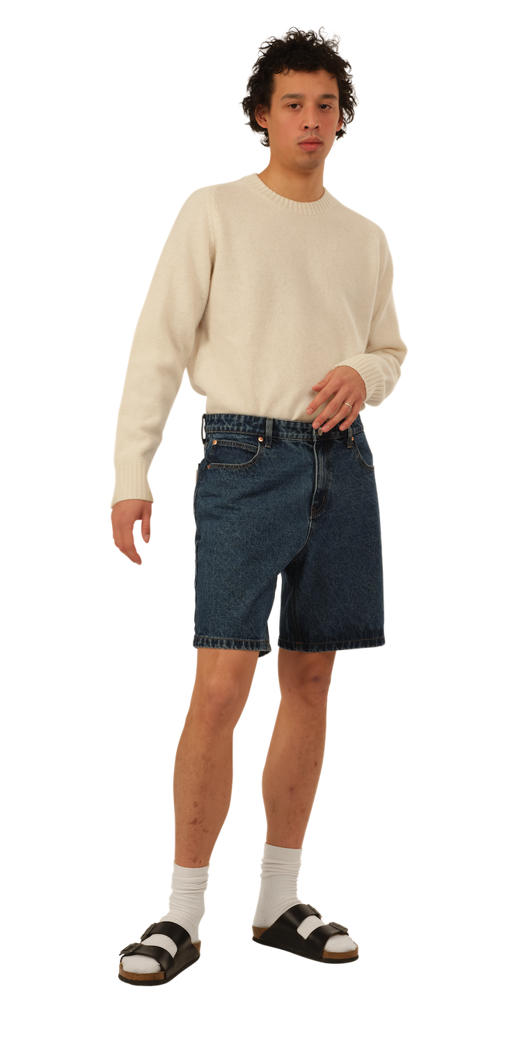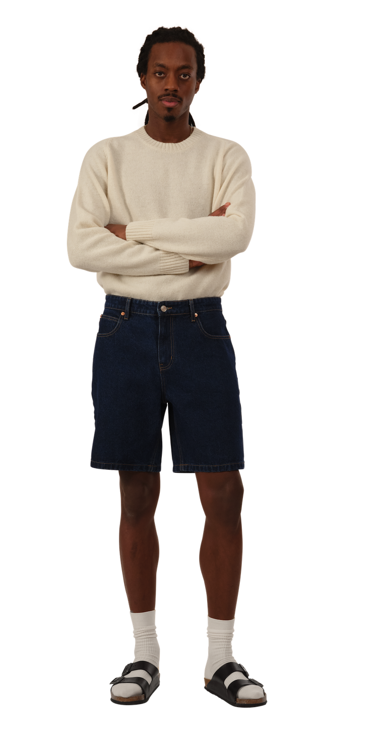 5 Pocket Blue Jean Shorts are made of heavy, 13.5 oz cotton denim. They have a classic jean shank, zip fly, and a relaxed fit.