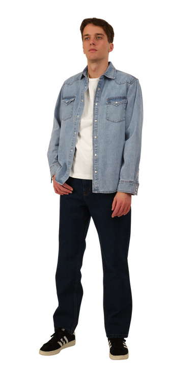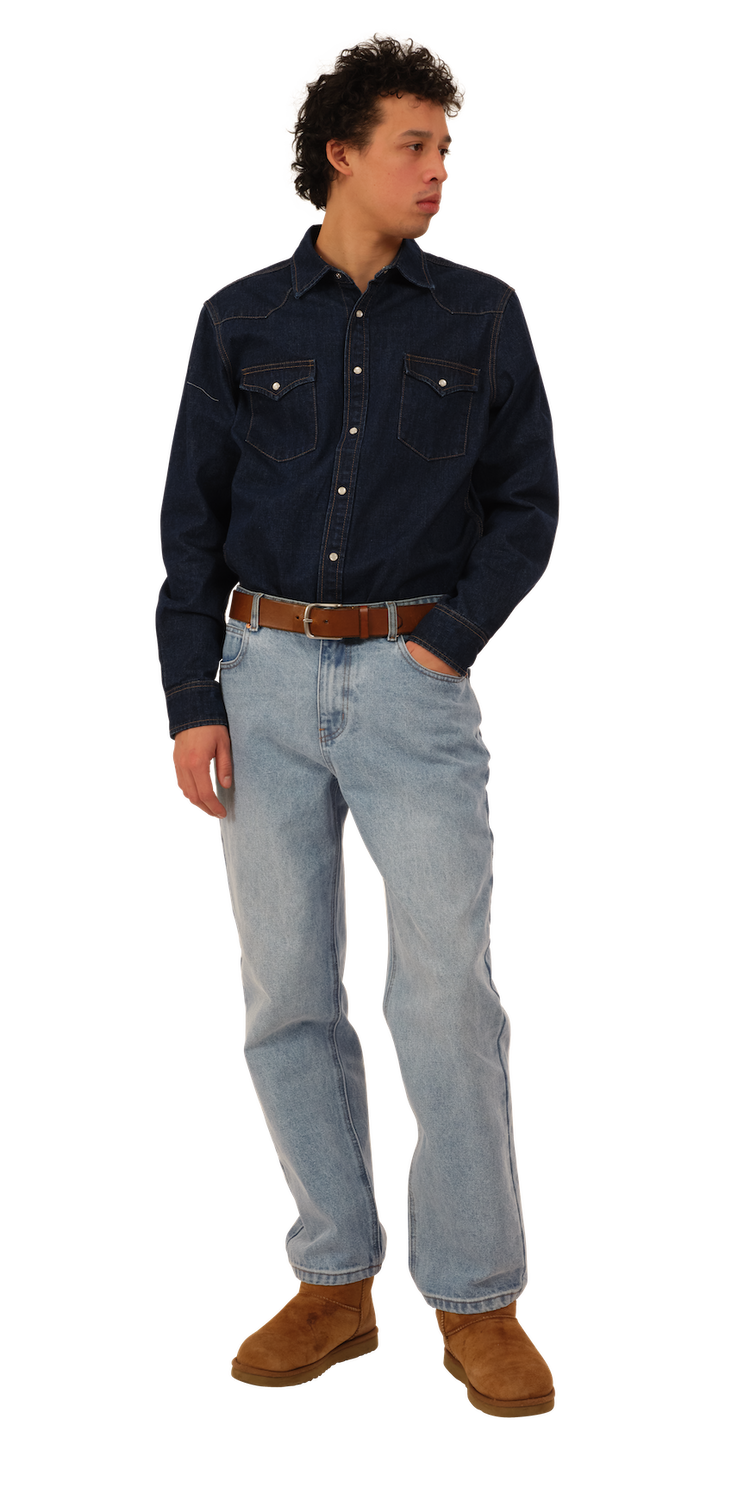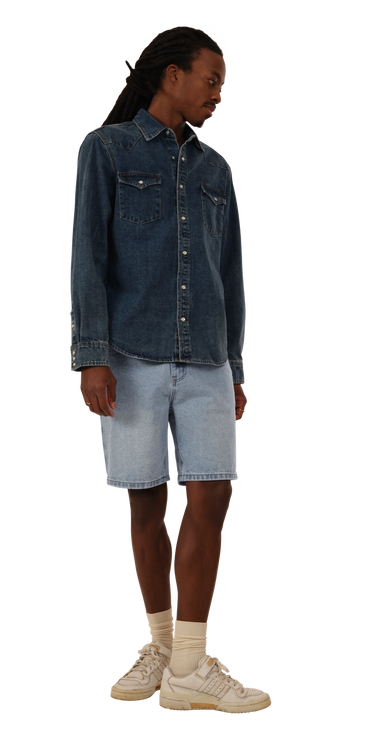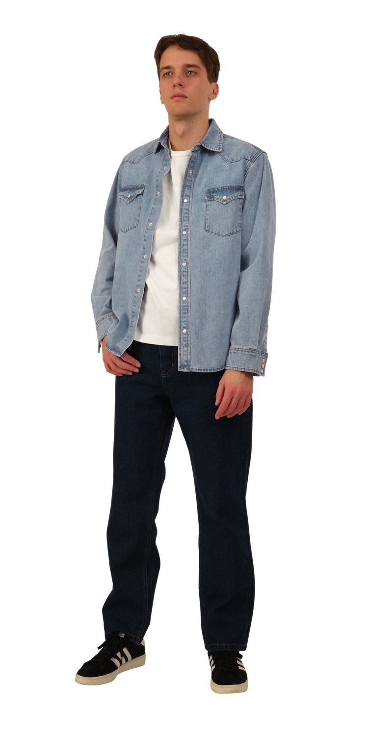 Western Shirts are made of washed cotton denim, with two front pockets, snap buttons, and a western yoke.