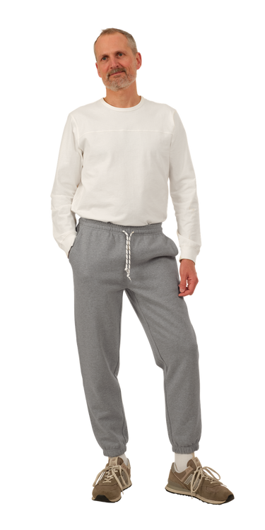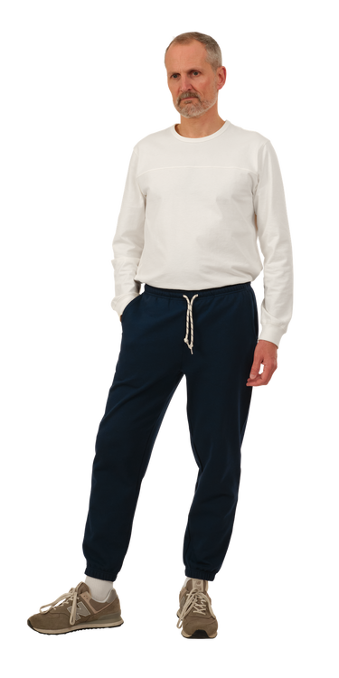 Sweat Shirts are made of heavy, dry terry. They have a relaxed fit, a side vent hem, and a white/navy drawstring.