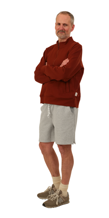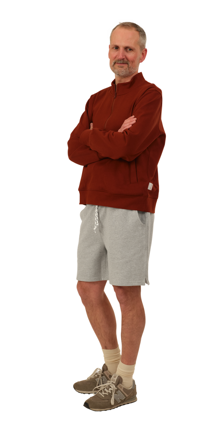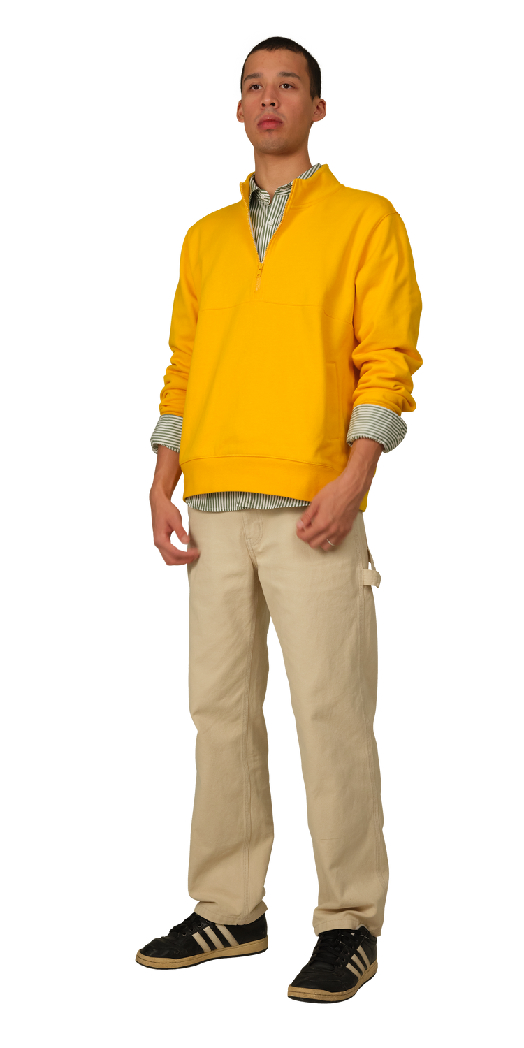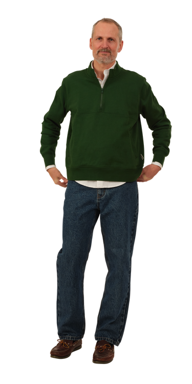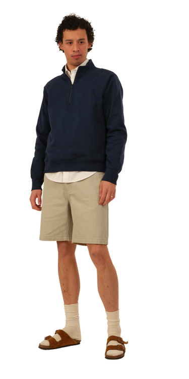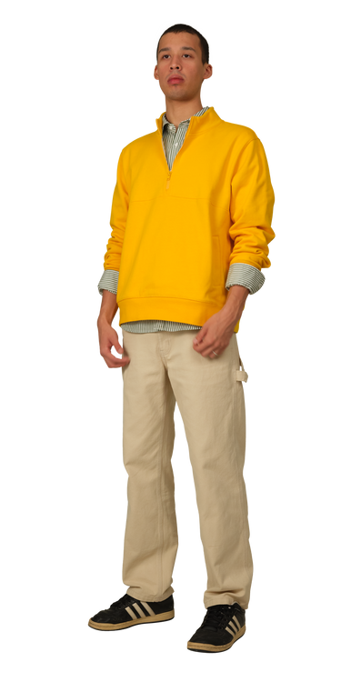 The Half Zip Sweatshirt is made of heavy French terry. It has a relaxed fit, a mock neck collar, nylon zipper, and two pockets.