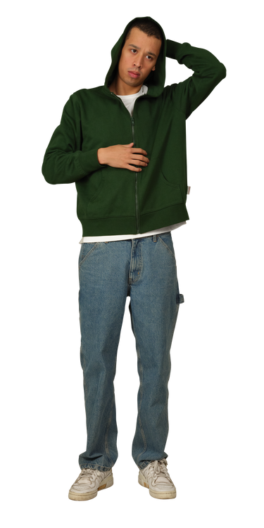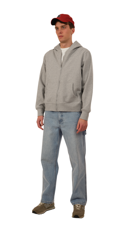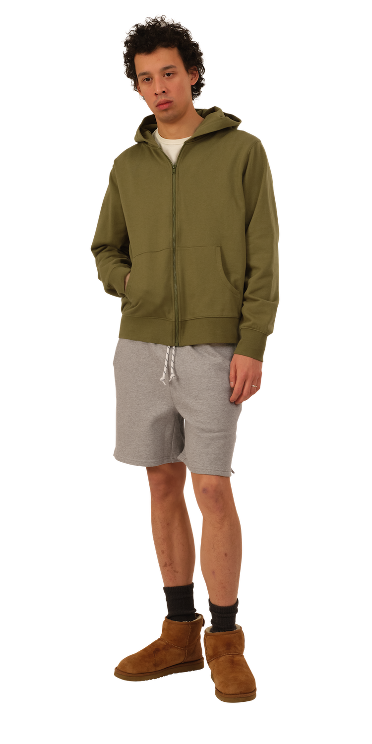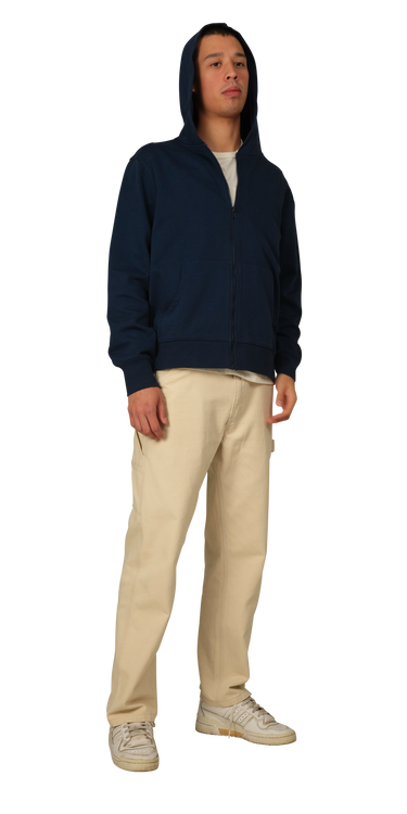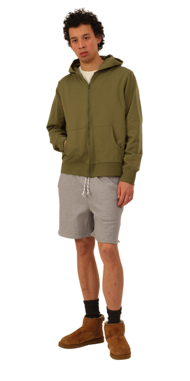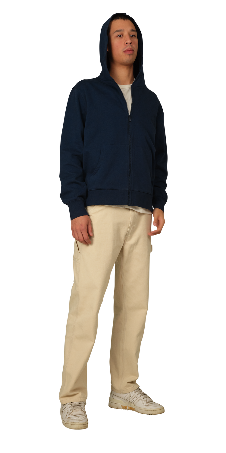 The Full Zip Hoodie is made of heavy French terry. It has a double-layered hood, patch pockets, and a chunky nylon zipper.