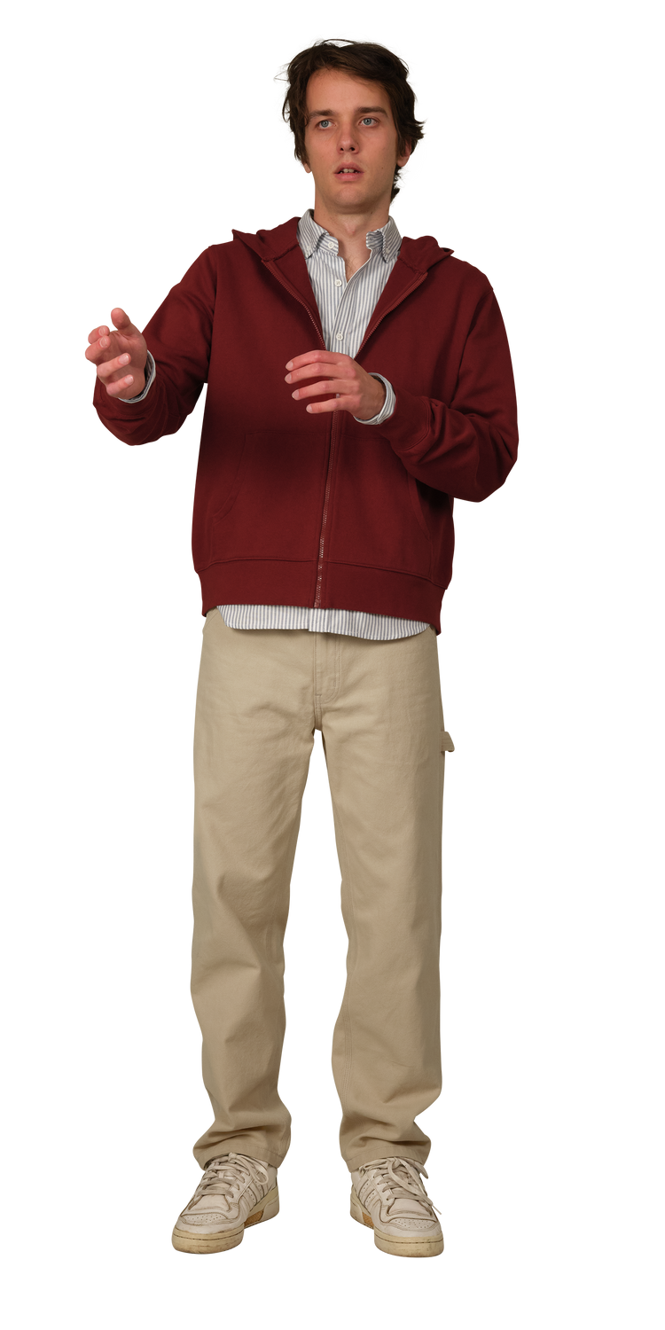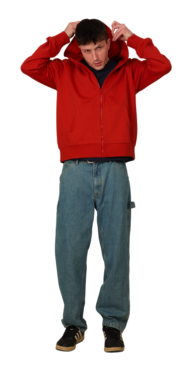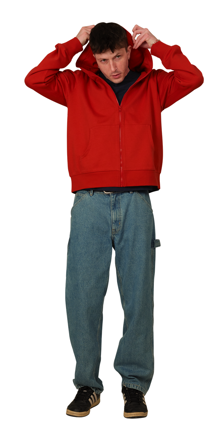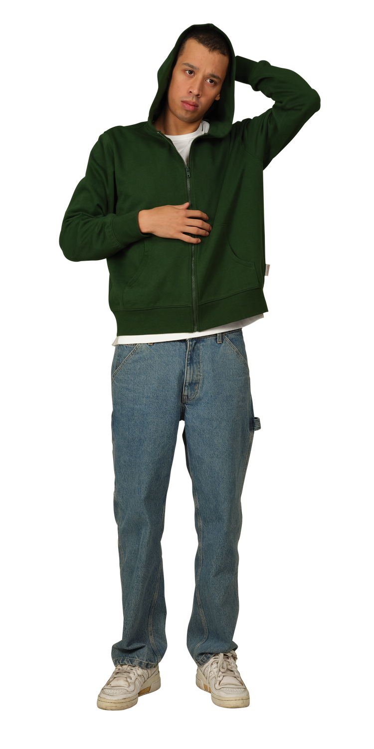 The Full Zip Hoodie is made of heavy French terry. It has a double-layered hood, patch pockets, and a chunky nylon zipper.