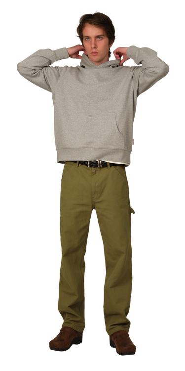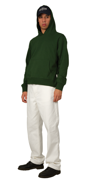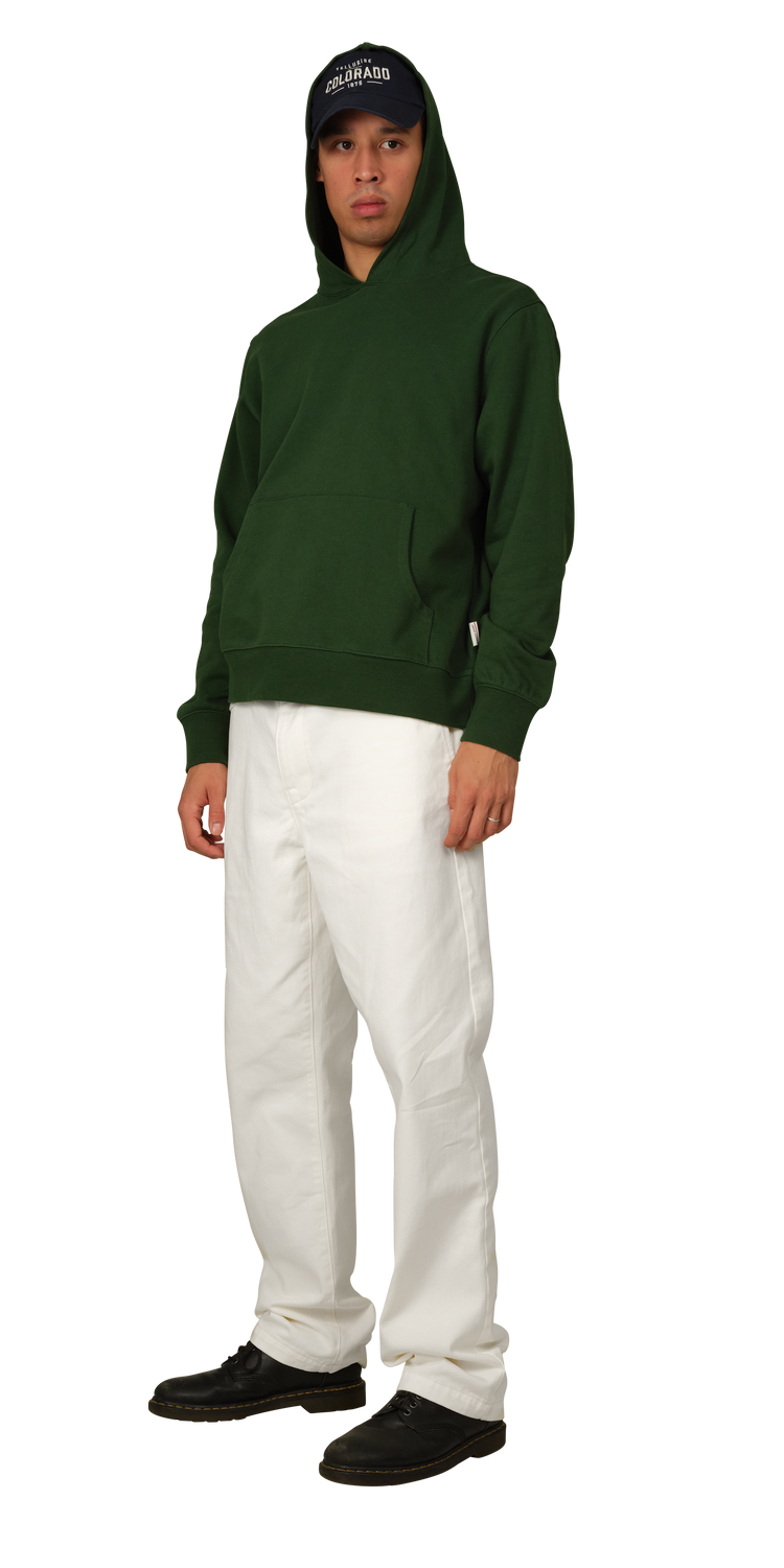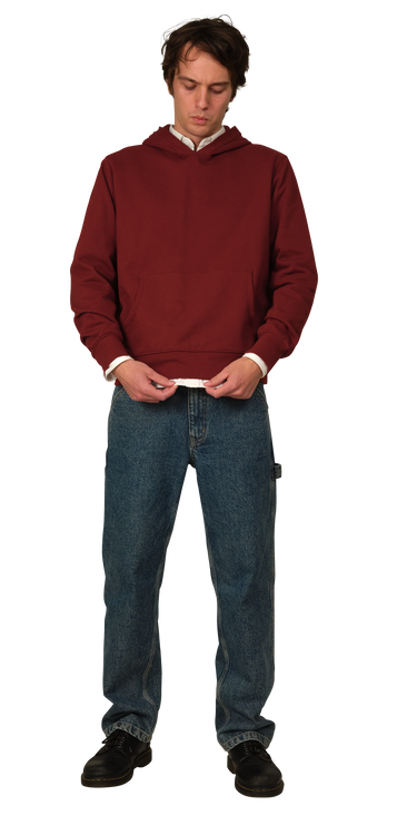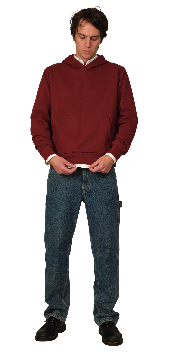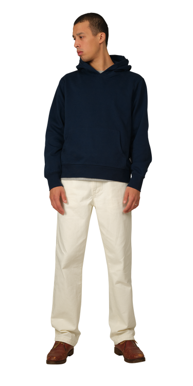 The Hoodie is made of a heavy french terry and has a generous double-layer hood, patch pocket, and eased ribbing.