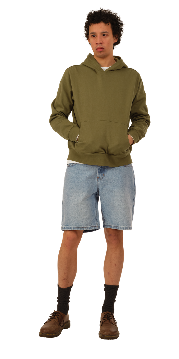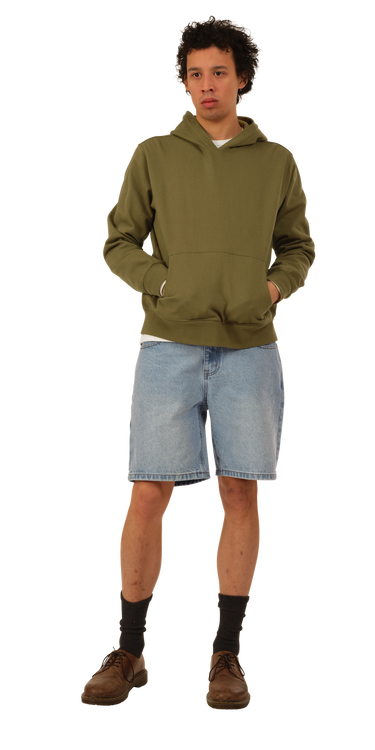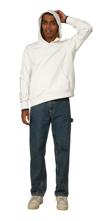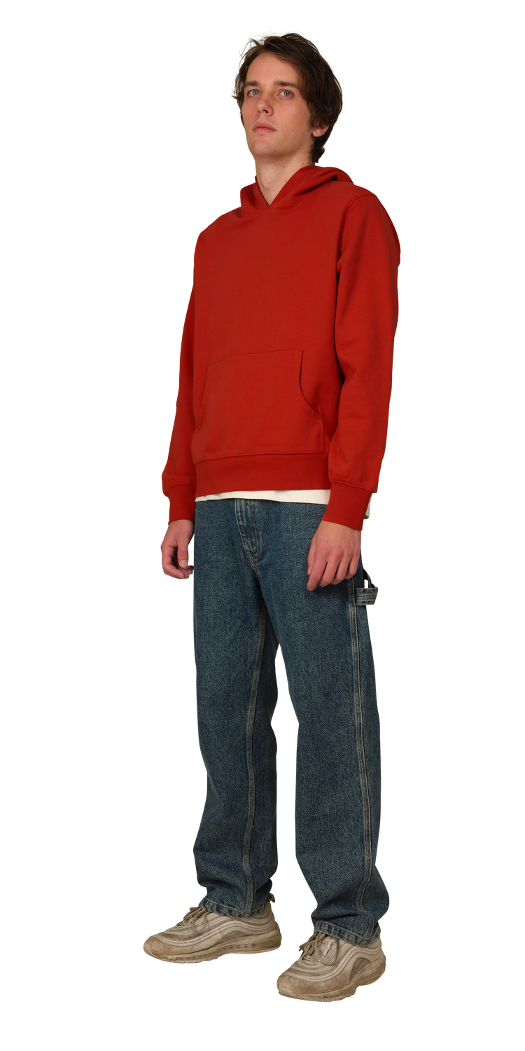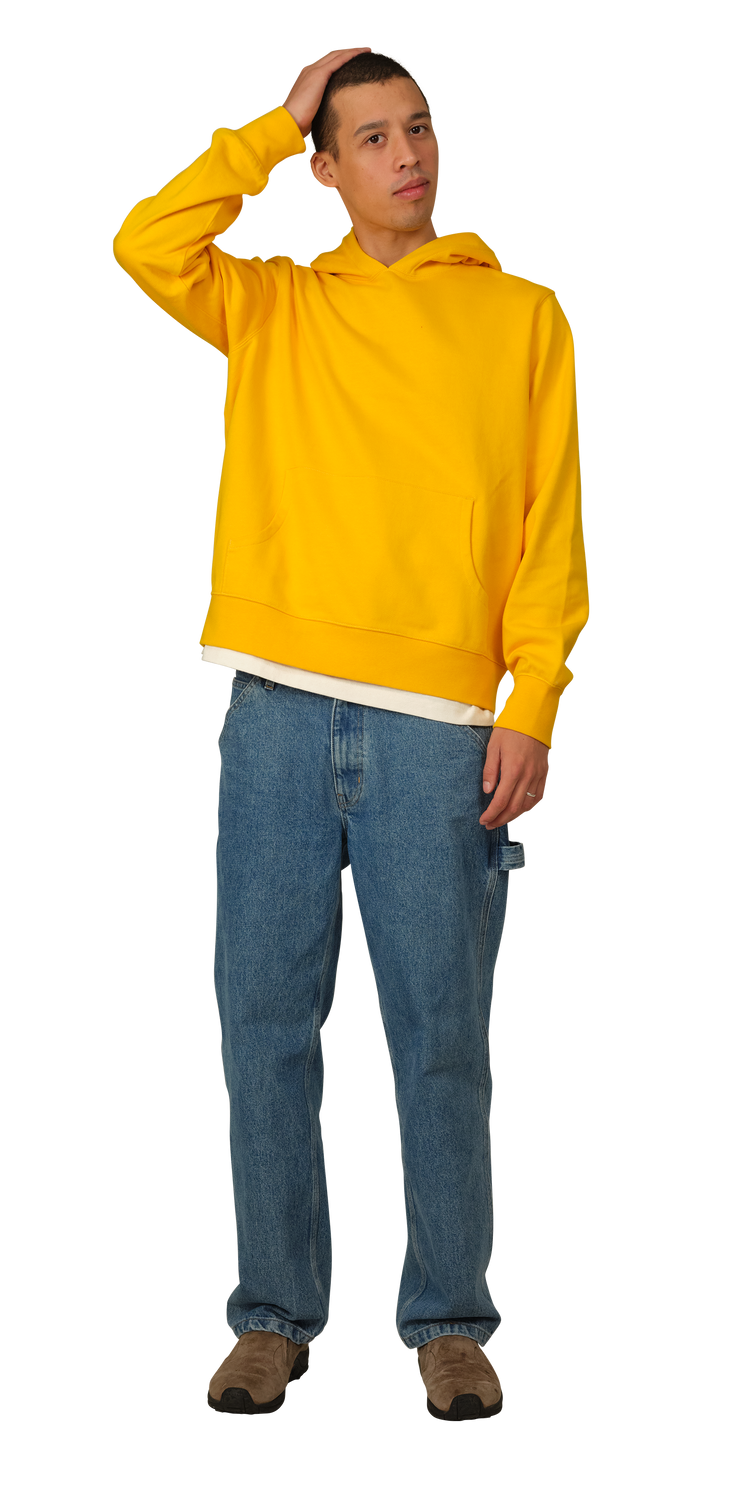 The Hoodie is made of a heavy french terry and has a generous double-layer hood, patch pocket, and eased ribbing.