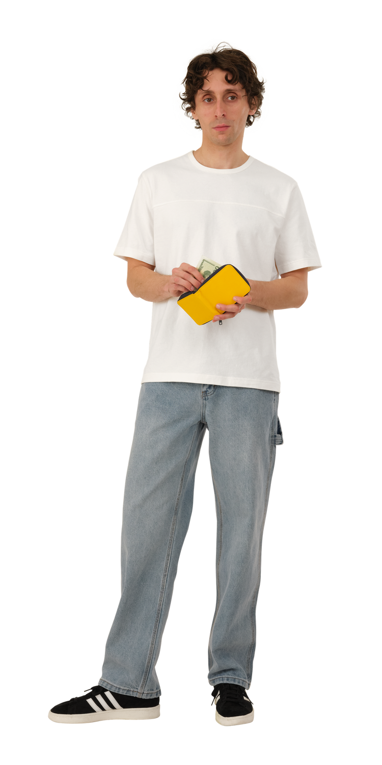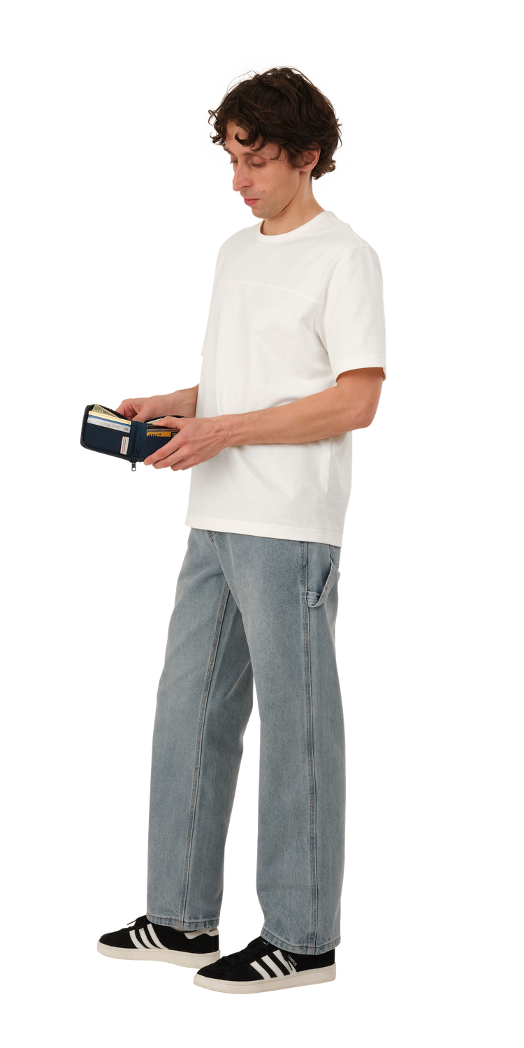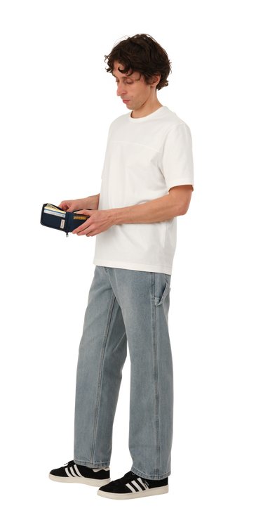 Wallet is made of a washed nylon fabric which gives each item unique depth and character. Featuring a full closure zip and slots for both cards and cash.