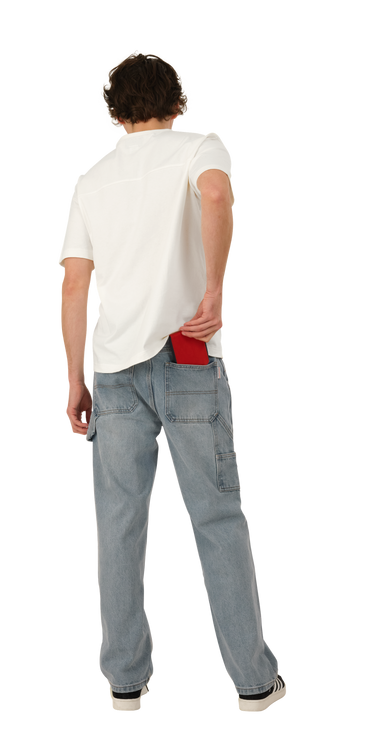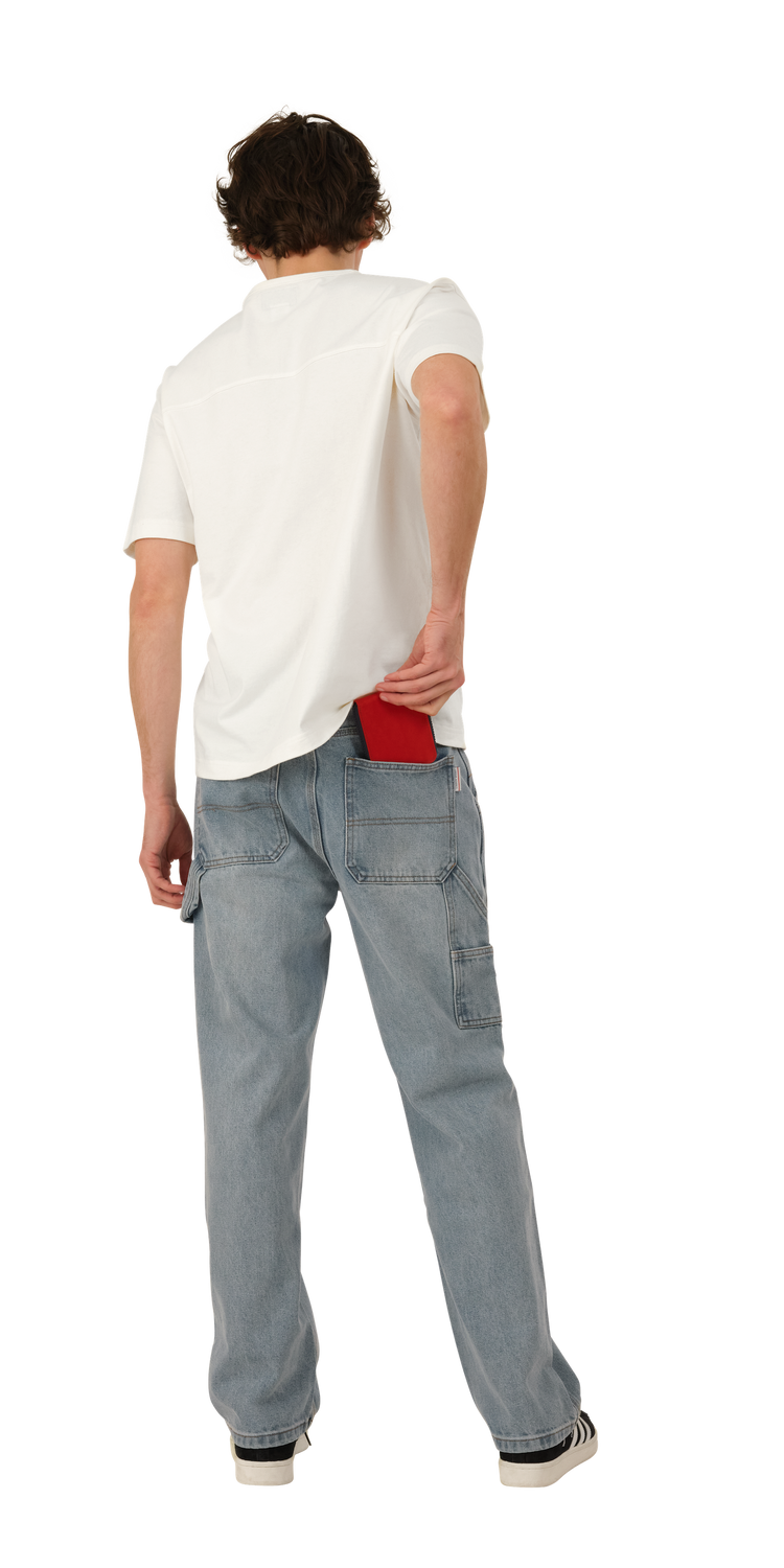 Denim Carpenter Jeans are made of a thick 13.5 oz cotton denim. They have a hammer loop, 4 pockets, and a relaxed fit.