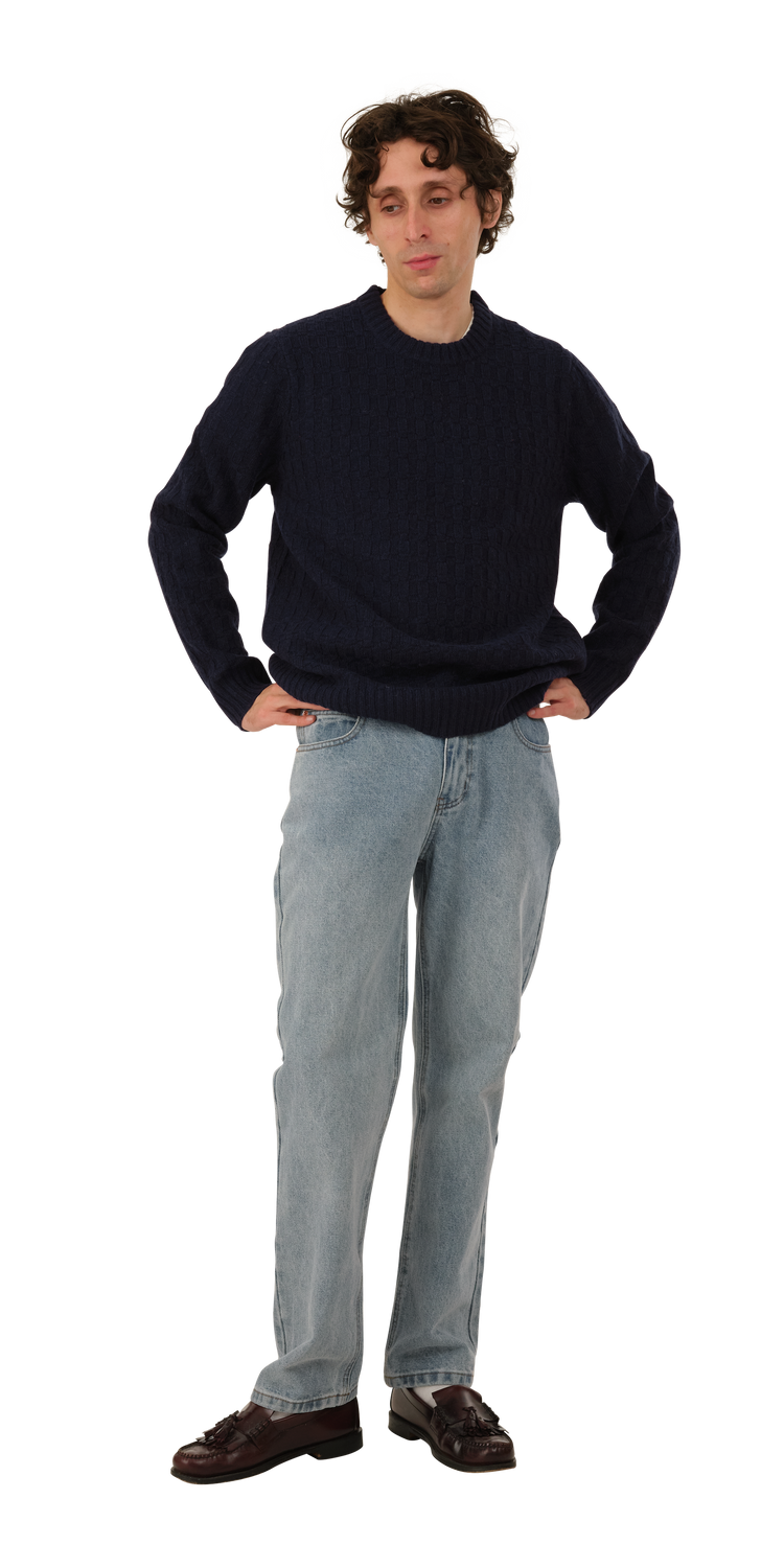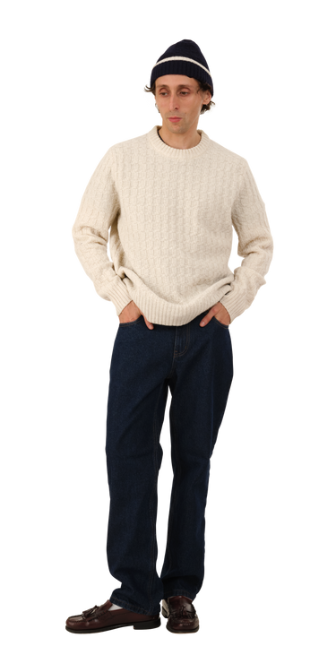 The Basketweave Sweater is a mid-weight cotton knit with a 'woven' texture. It has a crew neck and a chunky rib at the wrist and hem.