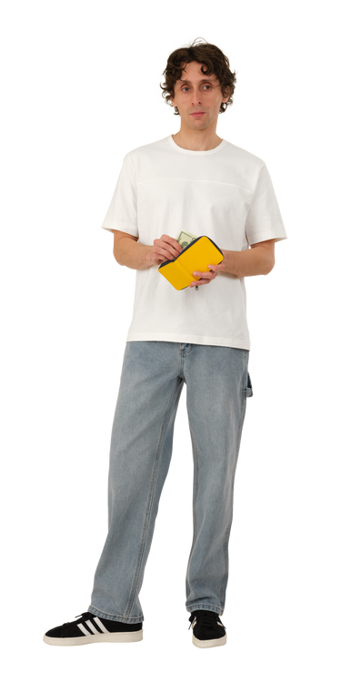 Wallet is made of a washed nylon fabric which gives each item unique depth and character. Featuring a full closure zip and slots for both cards and cash.