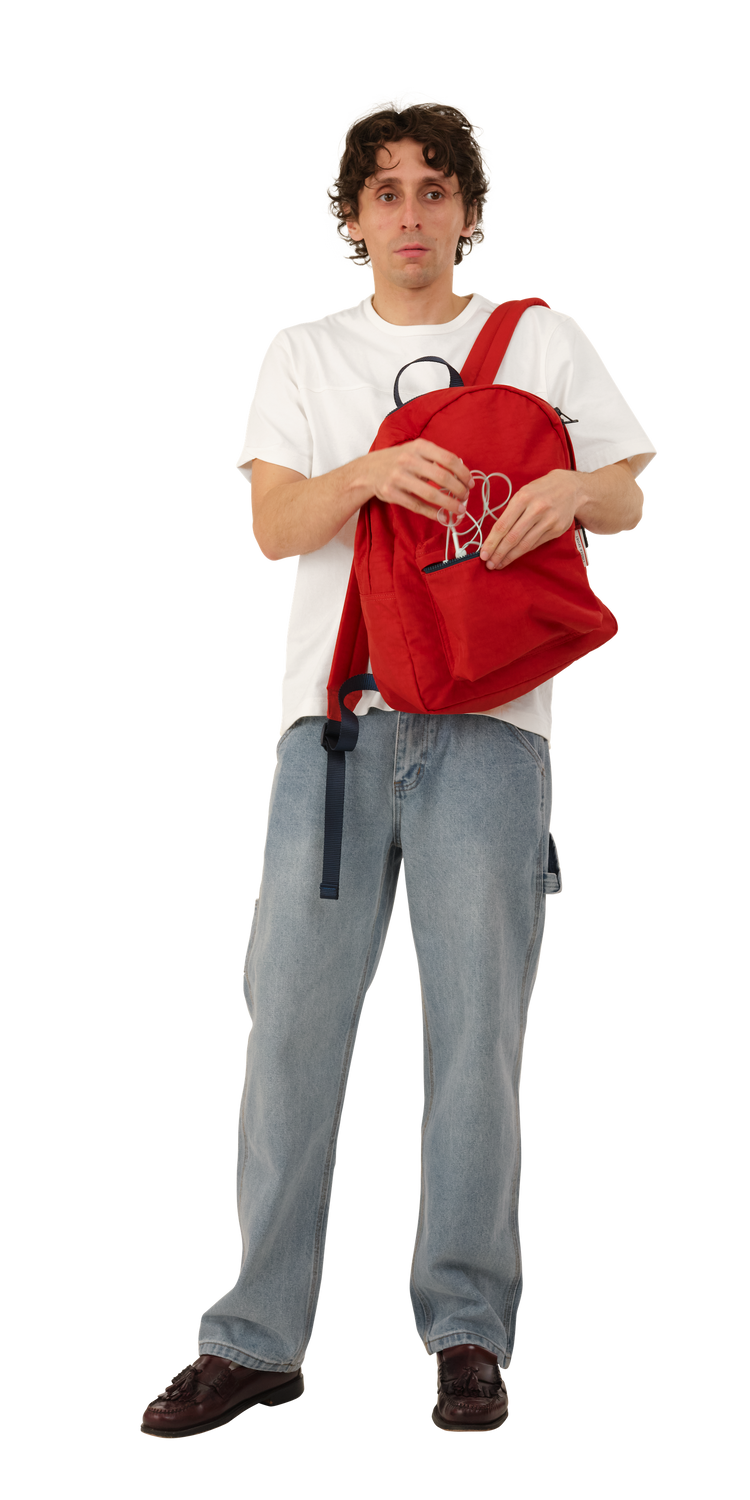 Back Pack is made of a washed nylon fabric which gives each item unique depth and character. Featuring a front pouch pocket and adjustable straps.