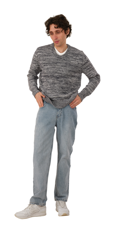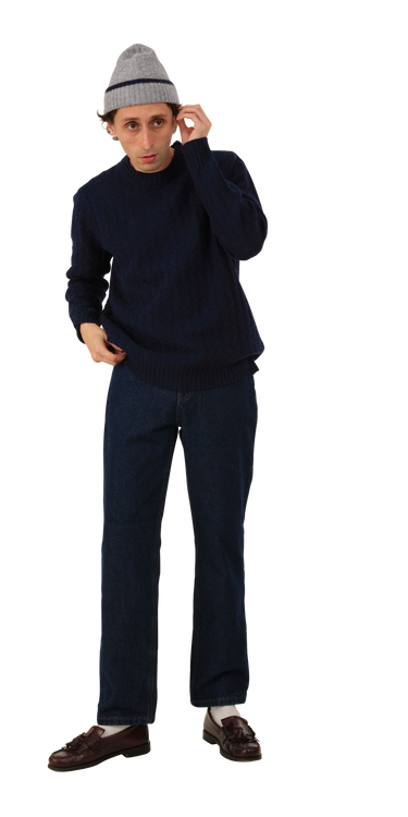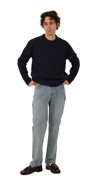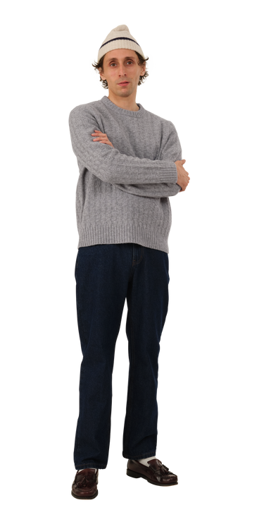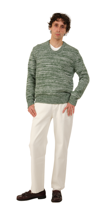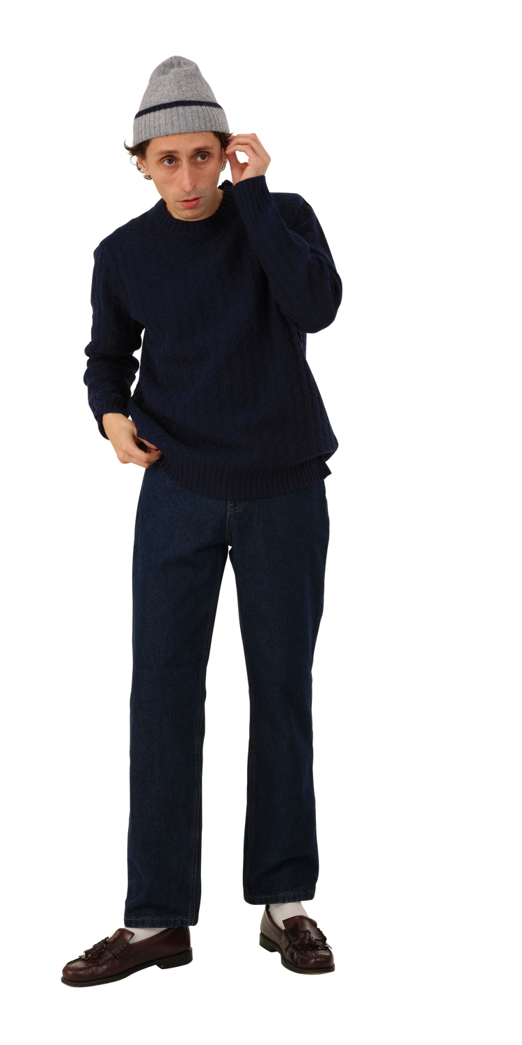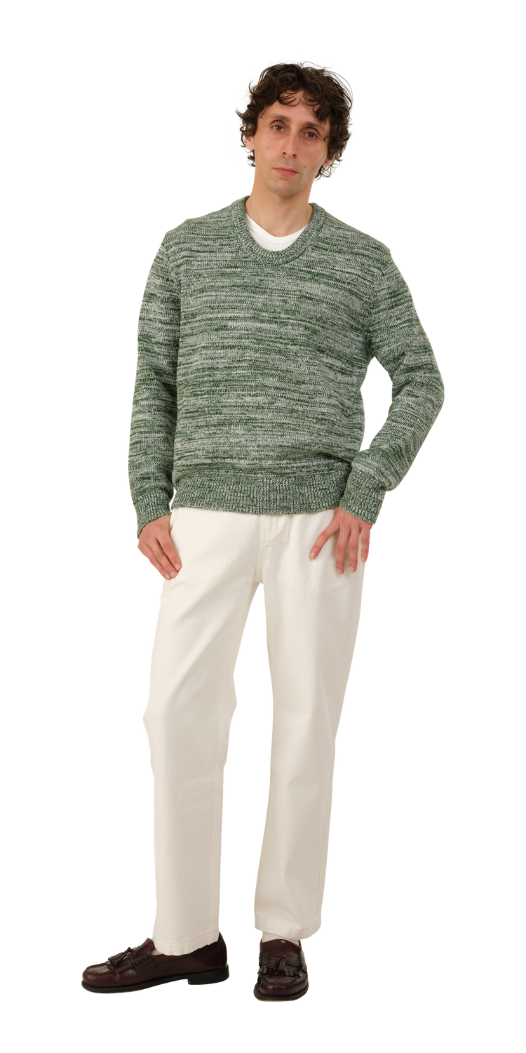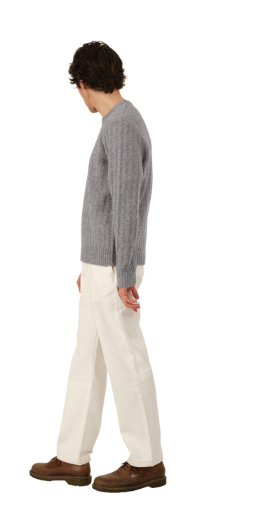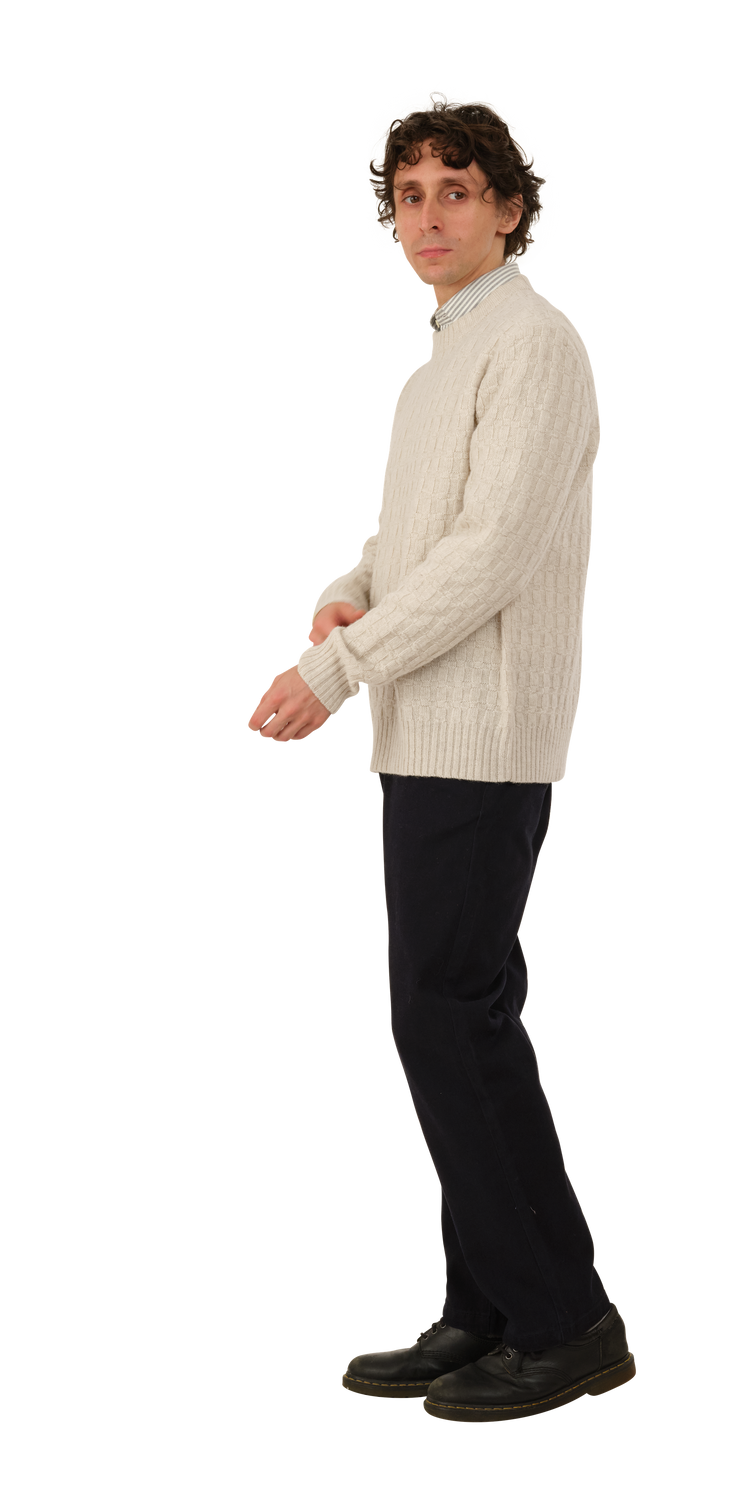 The Basketweave Sweater is a mid-weight cotton knit with a 'woven' texture. It has a crew neck and a chunky rib at the wrist and hem.