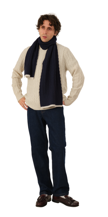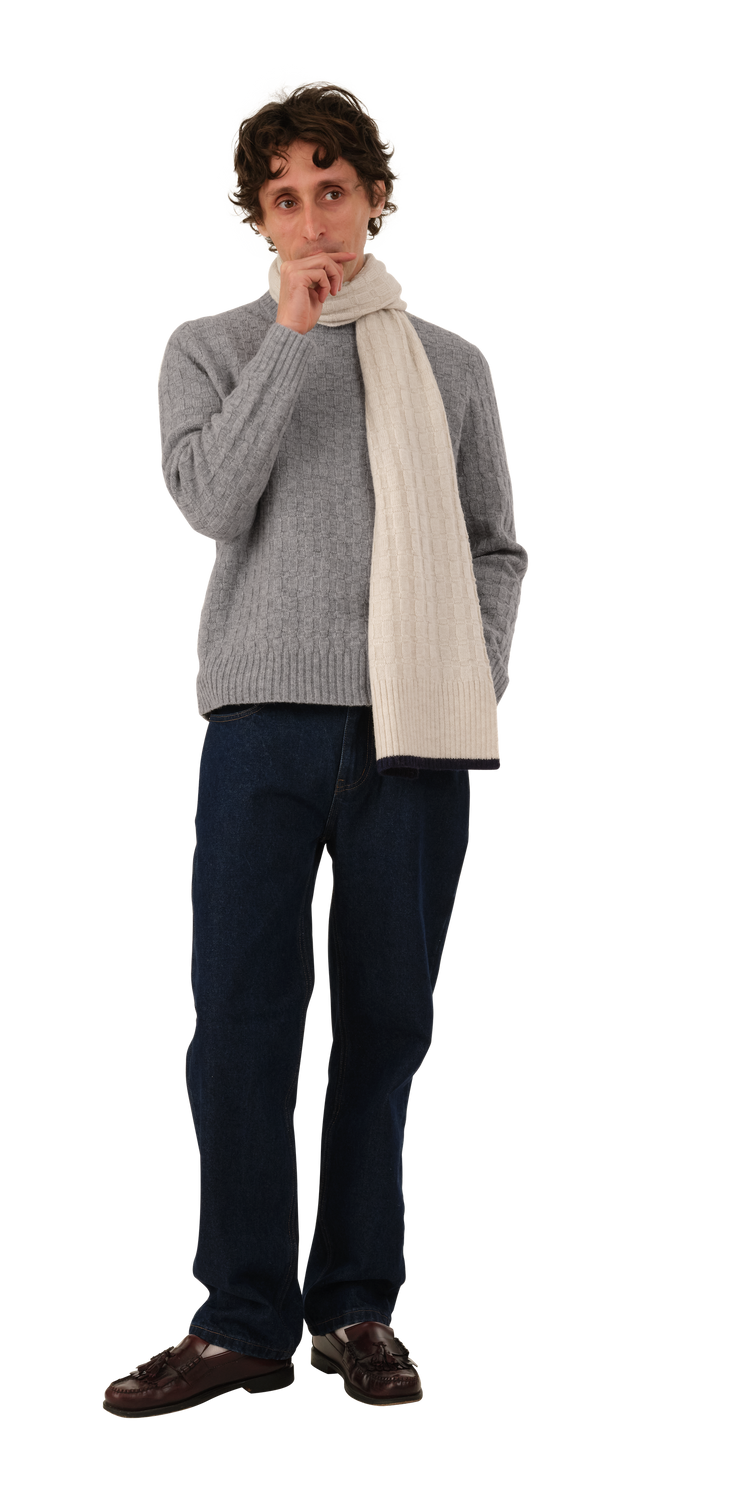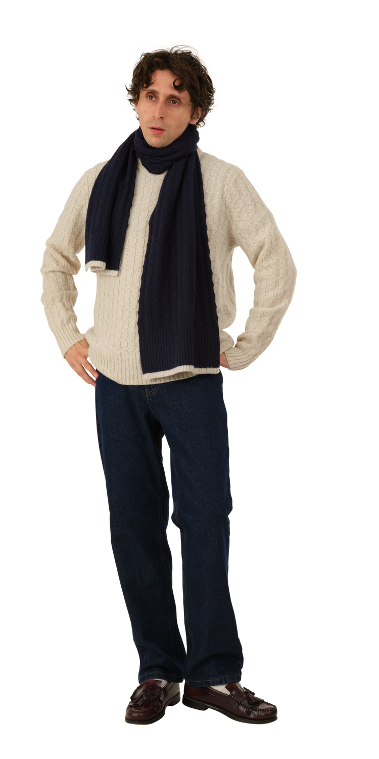 Wool Basketweave Scarf is a 100% Wool Scarf in a "Basketweave" knit with a contrast rib trim at the hem.
